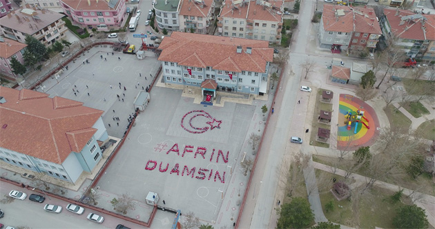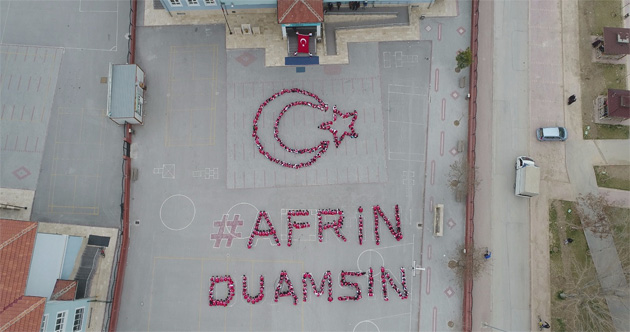Bedenleriyle şanlı bayrağımızı çizerek "Afrin Duamsın" yazan öğrenciler Zeytin Dalı Harekatını sürdüren Mehmetçiğimize selam gönderdi.