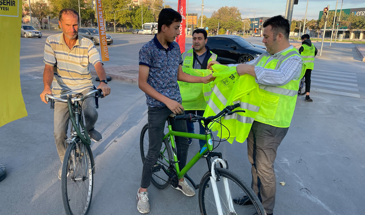 Konya Büyükşehir Belediyesi tarafından Avrupa Hareketlilik Haftası kapsamında ilk gün sabah erken saatlerde bisiklet yollarında reflektörlü yelek dağıtımı gerçekleştirildi. İşe bisikletle giden vatandaşlar kendilerine yelek dağıtılmasından duydukları memnuniyeti dile getirerek uygulamadan dolayı Büyükşehir Belediyesi’ne teşekkür etti.