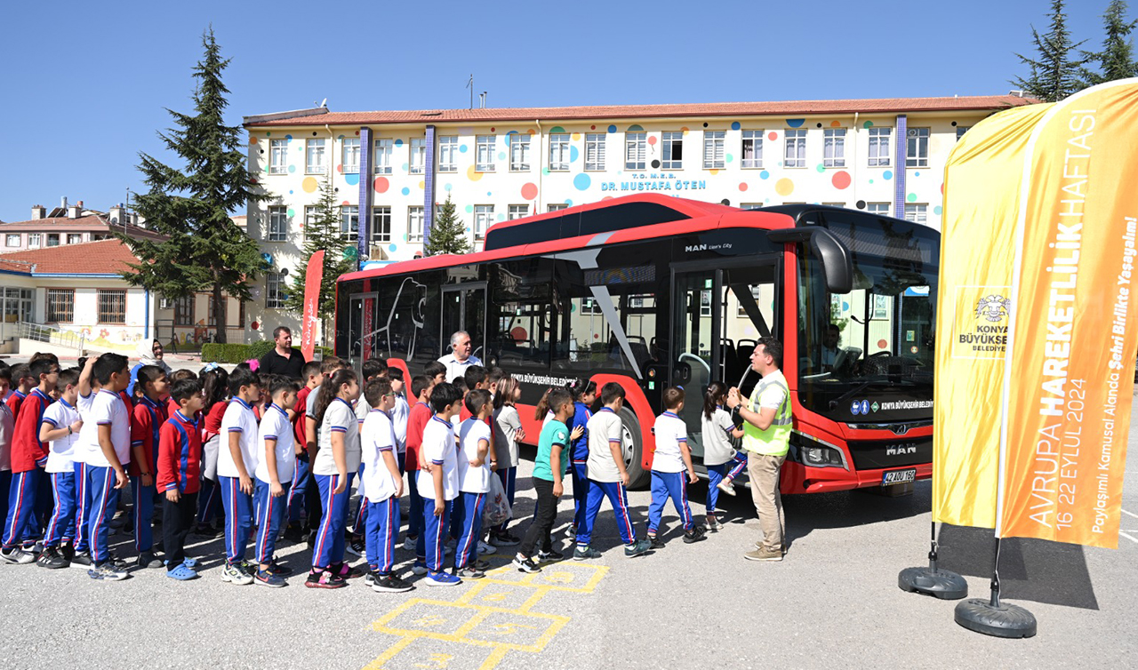 Bisiklet şehri Konya’da özellikle öğrencilerin bisiklet konusunda daha fazla bilinçlenmesi ve farkındalık oluşturulması amacıyla çalışan Büyükşehir Belediyesi hafta kapsamında belirlenen okullarda öğrencilere toplu ulaşım eğitimleri vererek bilinçlenmelerini sağlıyor.