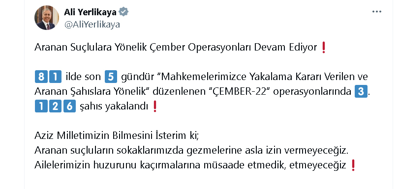 Bakan Yerlikaya, sosyal medya hesabından yaptığı açıklamada, İl Jandarma Komutanlıkları, İl Emniyet Müdürlükleri ve Sahil Güvenlik Komutanlığı'nca 81 il genelinde arama kaydı olanlara yönelik 81 il genelinde 5 gün boyunca 'Çember-22' operasyonları düzenlendiğini belirtti. Buna göre; yol aramaları, ev ve iş yerleri baskınları ile kimlik kontrolleri sonucu 'Hırsızlık', 'Dolandırıcılık', 'Yağma', 'Adam öldürme', 'Cinsel suçlar', 'Narkotik', 'Kaçakçılık' ve diğer suçlardan aranan toplam 3 bin 126 firari yakalandı.