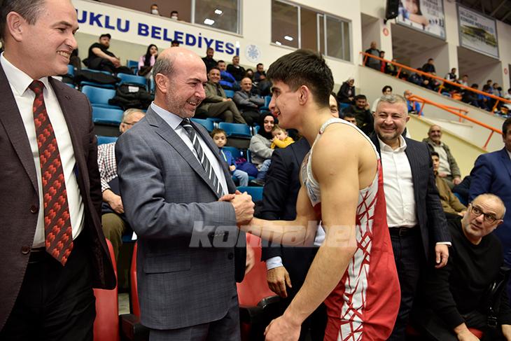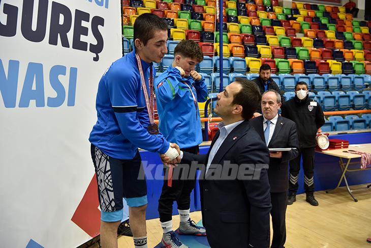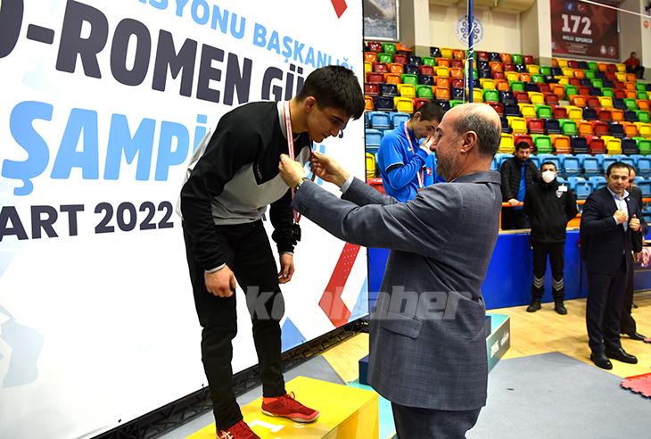 Uluslararası Spor Salonunda şampiyonanın ikinci gününde üç sıklette madalyalar sahibini buldu. 55 kg’da Selçuklu Belediyespor Kulübünü ve şehrimizi temsil eden Ahmet Ekrem Taşkınoğlu zorlu final maçından galibiyetle ayrılarak altın madalyanın sahibi oldu. Taşkınoğlu’na madalyasını Selçuklu Belediye Başkanı Ahmet Pekyatırmacı takdim etti.