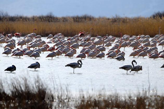 Kırmızı renkleriyle halk arasında "allı turna" olarak bilinen flamingoların yazın sonuna kadar bölgede kalması bekleniyor.Sazlıklar, onlarca kuş türü ile fotoğraf tutkunları ve doğa severleri cezbediyor.