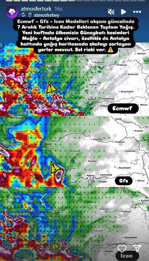 AtmosferTürk tarafından yapılan paylaşımda, "Ecmwf - Gfs - Icon Modelleri'ne göre, 7 Aralık'a kadar ülkemizin güneybatı bölgelerinde, özellikle Muğla ve Antalya civarlarında yoğun yağışlar bekleniyor. Bu bölgelerde sel riski söz konusu" denildi.