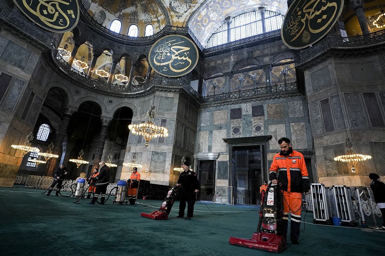Halılar elektrik süpürgeleriyle süpürüldü, tozu alınan ayakkabılıklara ve caminin içine dezenfektan sıkıldı. Şadırvan, cami avlusu ve Ayasofya meydanı sıcak su ve dezenfektanla yıkandı. Temizlik işlemi sonrası caminin içine ve dışına gül suyu sıkıldı.
