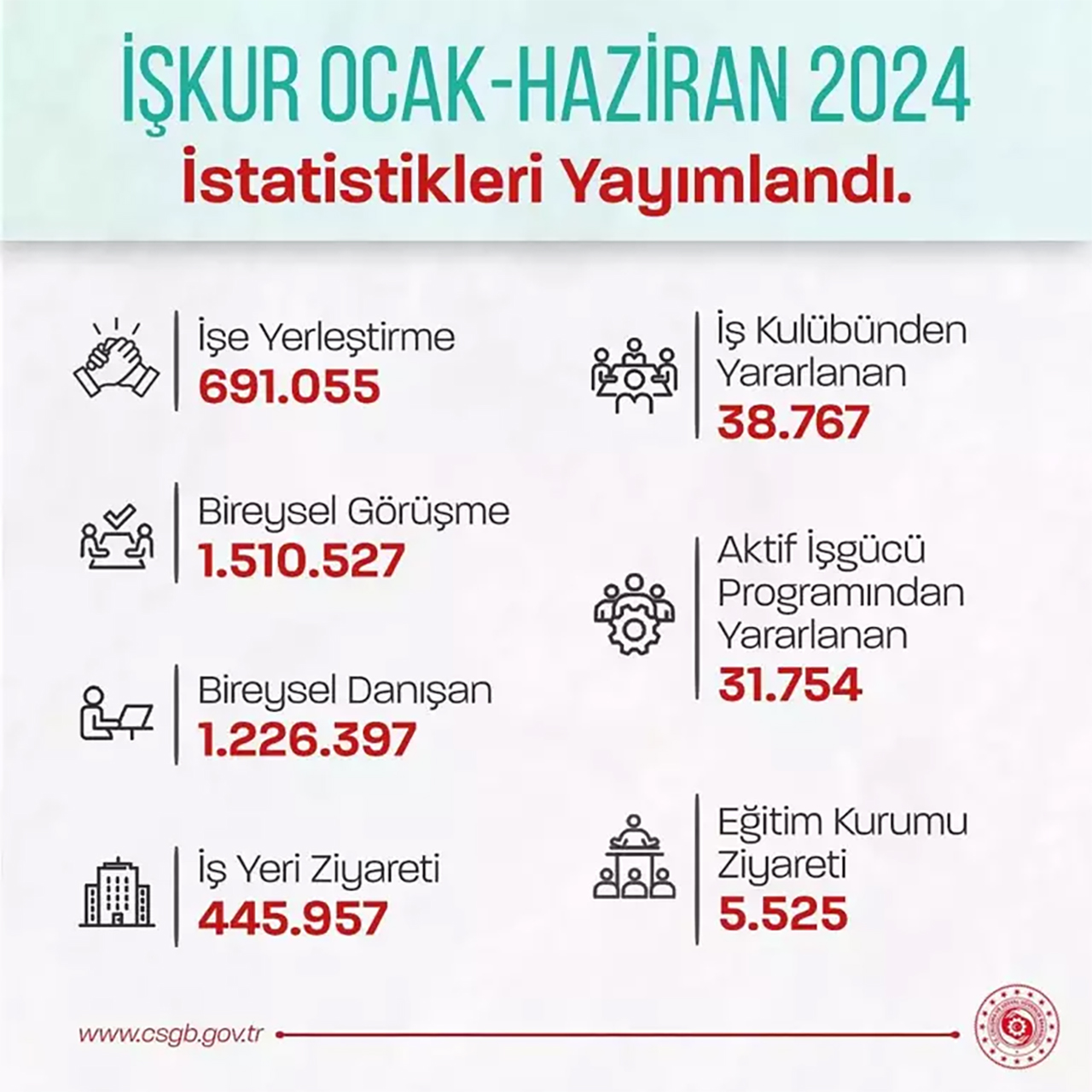 Bakan Işıkhan, sosyal medya hesabından yaptığı açıklamada, "İŞKUR'un hazırladığı ve 2024'ün ilk yarısında hizmetlerimize ilişkin verileri içeren Haziran ayı İstatistik Bülteni yayımlandı. 2024 yılı Ocak-Haziran ayları arasında 691 bin 55 vatandaşımızın işe yerleştirilmesine aracılık ettik. Bu oranda geçen yıla göre yüzde 18,3 artış kaydettik. İş ve meslek danışmanlığı hizmetlerimiz kapsamında 1 milyon 510 bin 527 bireysel görüşme gerçekleştirdik. 445 bin 957 iş yeri ziyareti yaptık. İstihdam odaklı büyümenin sağlanması ve vatandaşlarımıza iş imkanı sunulması için çalışmalarımızı sürdüreceğiz" dedi.
