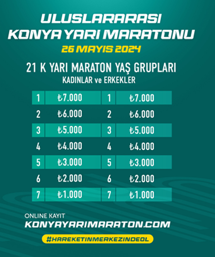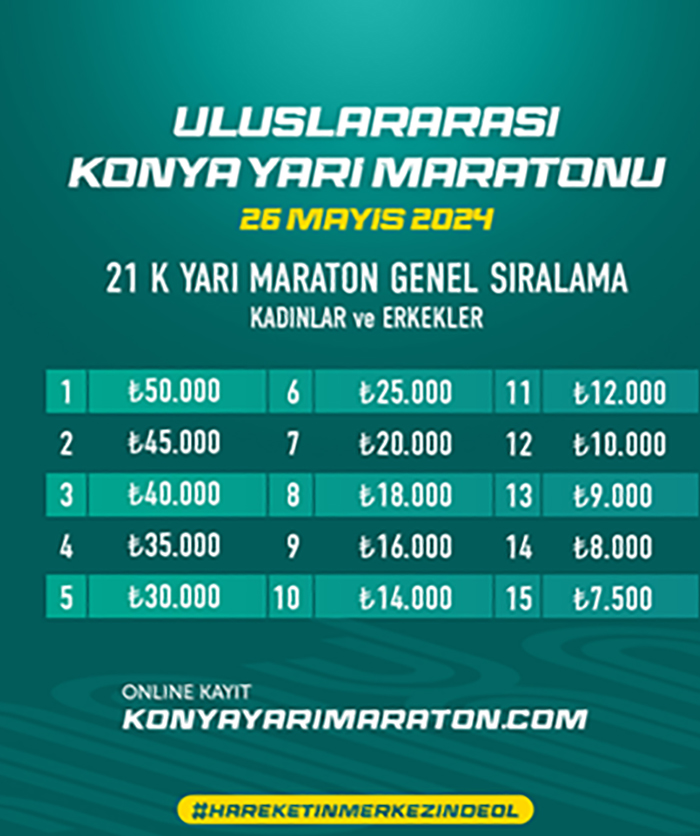 3.Uluslararası Konya Yarı maratonu Dünya'nın birçok yerinden sporseverleri ağırlayacak. Bir çok sporcunun katılım sağlayacağı Konya Yarı Maratonu'nda ödüller de belli oldu. Yarışmayı kazanan ilk 15 kişiye para ödülü verilecek. Birinciye 50 bin TL para ödülü takdim edilecek.