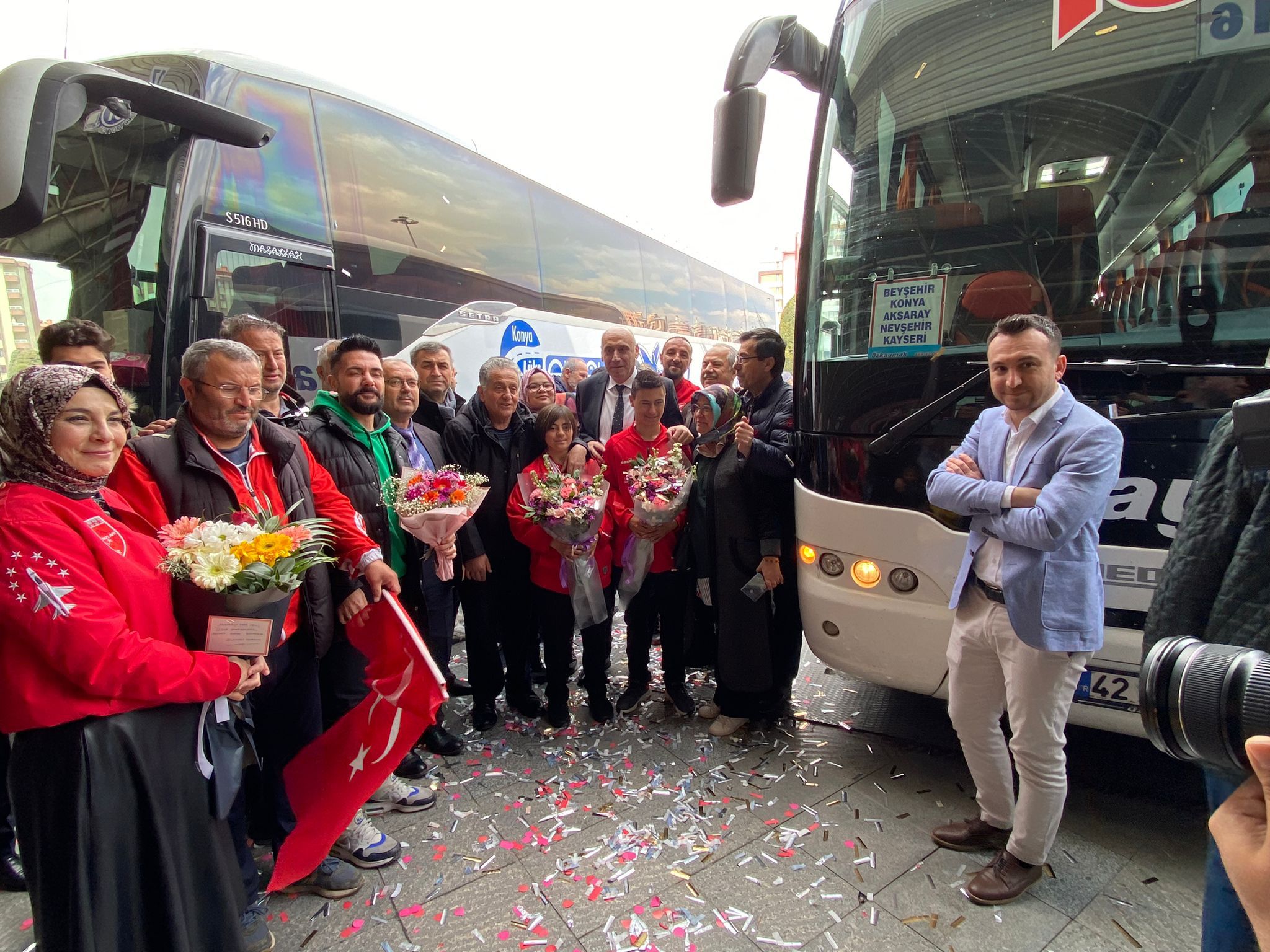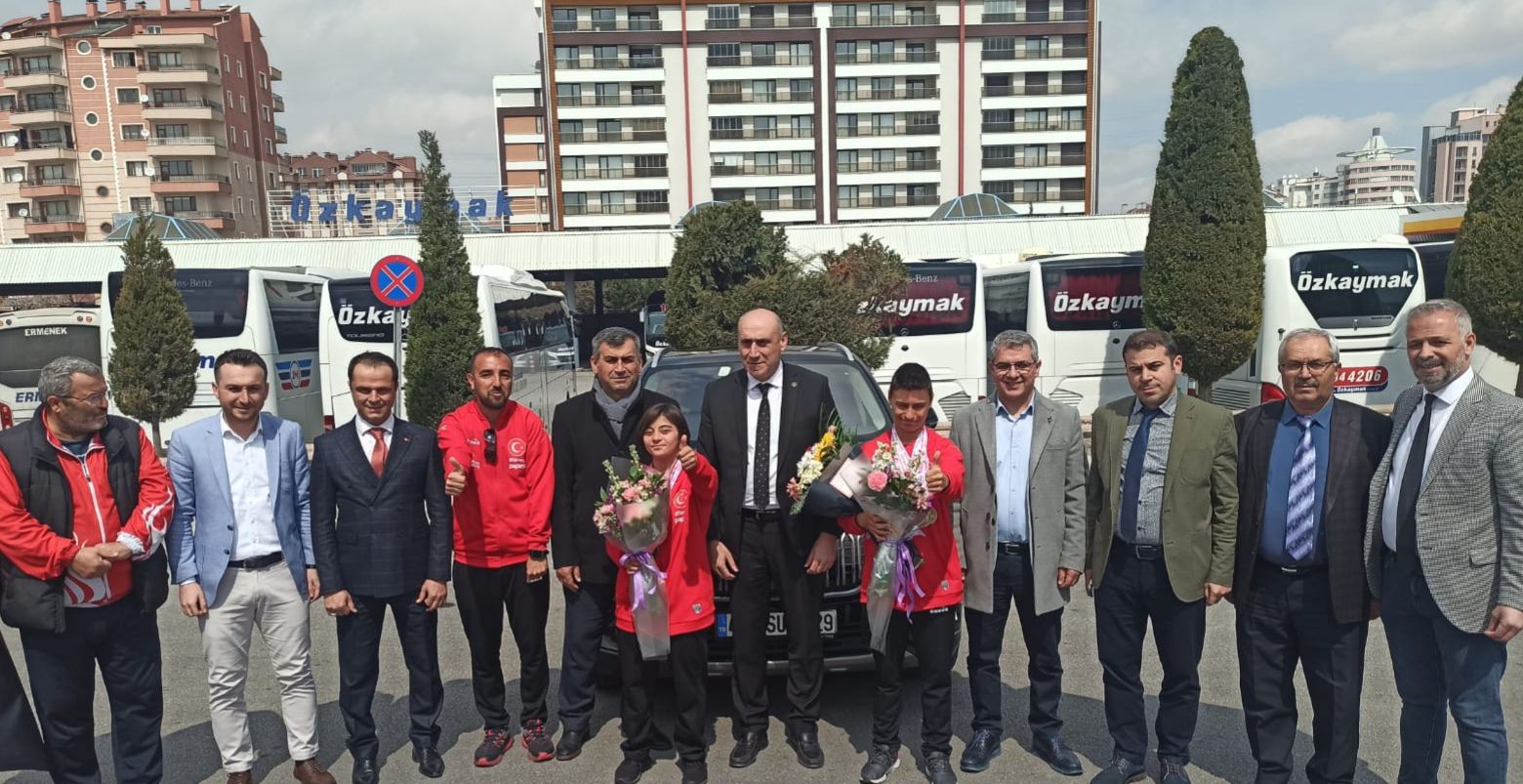 Atletizm milli takımında yer alan Muhammed Eren Uysal ve Berfin Yılmaz Atletizm Milli Takımımızın Dünya Şampiyonu olmasında önemli rol oynamıştı. Muhammed Eren Uysal 800 ve bin 500 metre yürüyüş altın madalya kazanırken; bin 500 metre koşuda ise dünya rekoru kırarak altın madalyanın sahibi olmuştu. Berfin Yılmaz ise T21 kategorisinde bin 500 metre yürüyüş gümüş madalya kazanmıştı. Konya'da büyük bir coşkuyla karşılanan başarılı sporcular, madalyaları TOGG ile Konya turu yaparak kutladı. (Hasan Yıldırım)