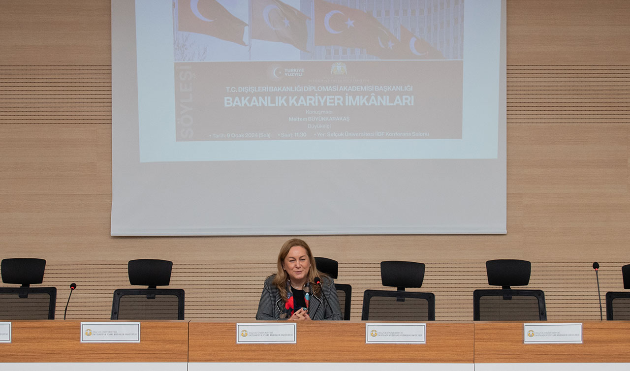Mesleki tecrübelerini paylaşan ve Dışişleri Bakanlığının teşkilat yapısı ile sunduğu kariyer imkanları hakkında bilgi veren Büyükelçi Meltem Büyükkarakaş, “Dış politikamızın amaçları arasında uluslararası çıkarlarımızı yurt dışında güvenceye almak, hem bölgemizde hem küresel düzeyde barış, istikrar ve refaha katkıda bulunmak, krizlerin yönetiminde aktif rol almak da var. Bugün dünyanın en gelişmiş diplomatik ağına sahip beşinci ülkeyiz. 146 büyükelçiliğimiz, 99 da başkonsolosluğumuz var. Personel ihtiyacımızın artması, sizler için de birtakım fırsatlar sunuyor.” ifadelerini kullandı.
