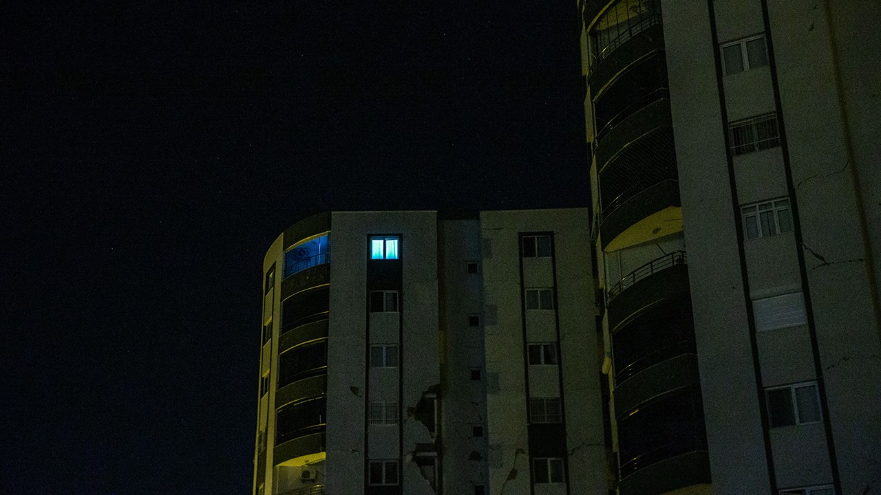 Hatay'ın İskenderun ilçesinde, depremlerden sonra kimsenin bulunmadığı bazı dairelerin ışıkları açık kaldı.