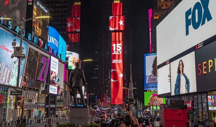 Times Meydanı'ndaki led ekranlarda, "Demokrasi Zaferi" ve "Türkiye Geçilmez" mesajlarına yer verildi.