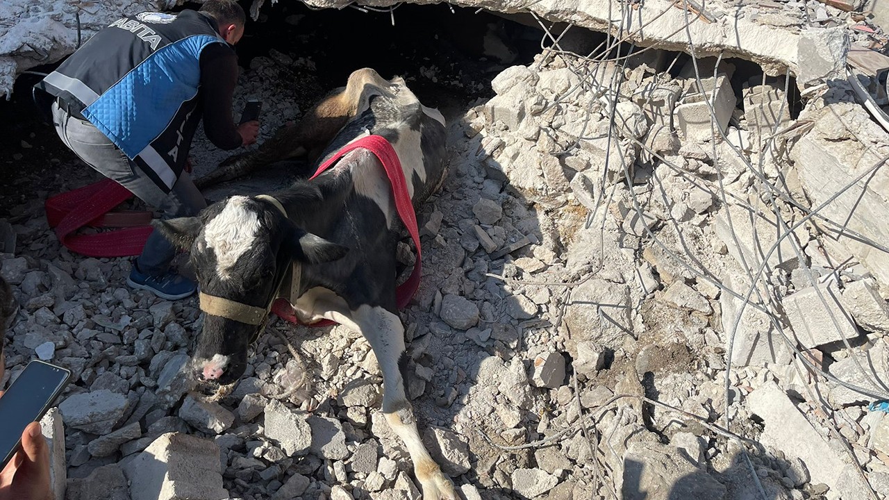 Kahramanmaraş merkezli depremlerden etkilenen Hatay'ın Antakya ilçesinde enkazda kalan ineği, Gölcük Belediyesi ekipleri 17 gün sonra kurtardı.