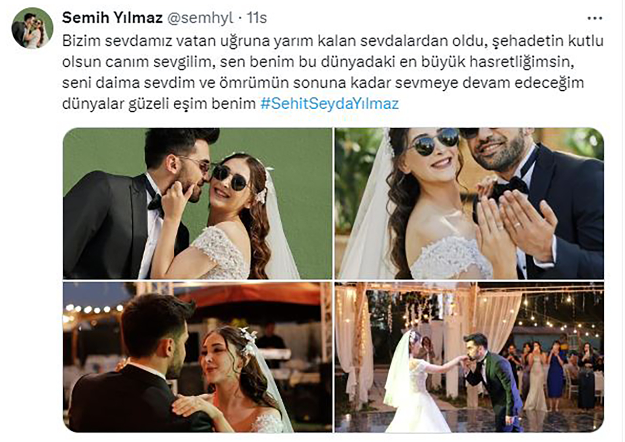 Şehit Şeyda Yılmaz ise dün memleketi Sivas'ta toprağa verildi. Yılmaz'ın polis memuru eşi Semih Yılmaz, sosyal medyadan yaptığı paylaşımda, "Bizim sevdamız vatan uğruna yarım kalan sevdalardan oldu, şehadetin kutlu olsun canım sevgilim, sen benim bu dünyadaki en büyük hasretliğimsin, seni daima sevdim ve ömrümün sonuna kadar sevmeye devam edeceğim dünyalar güzeli eşim benim" ifadelerine yer verdi.