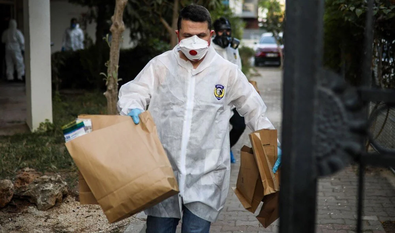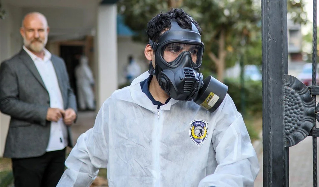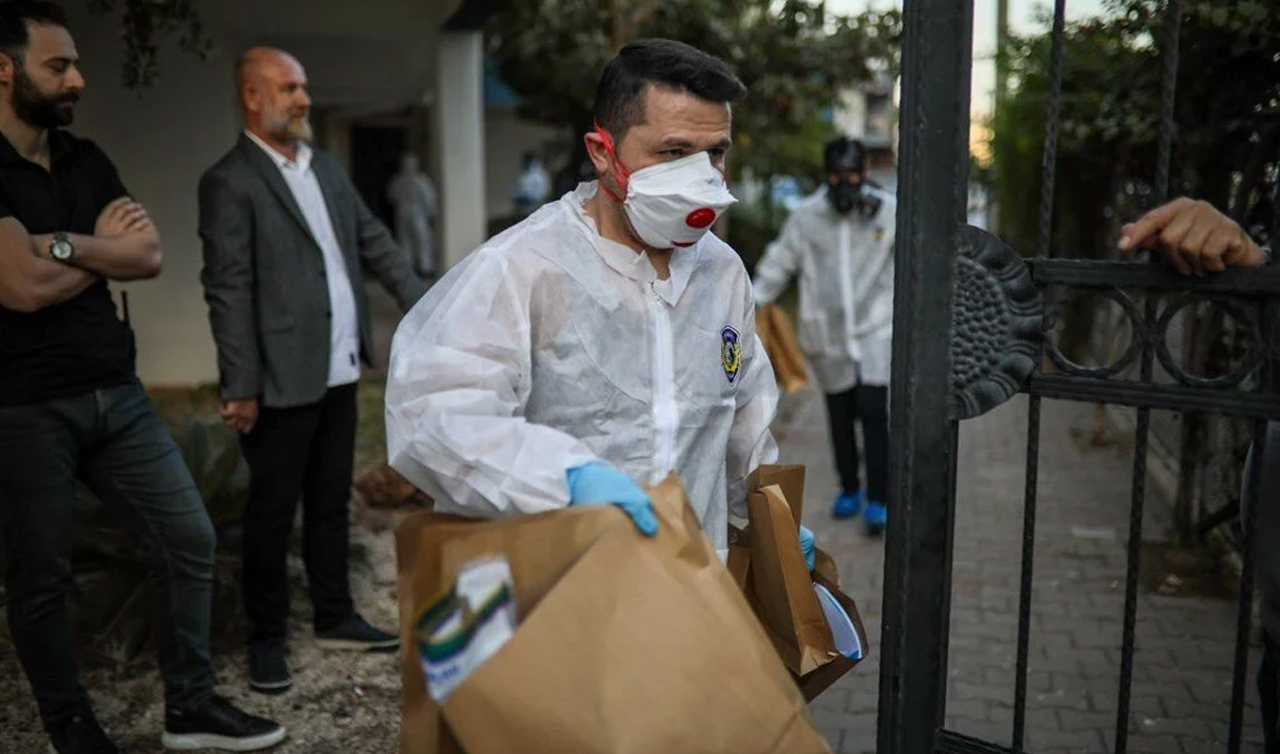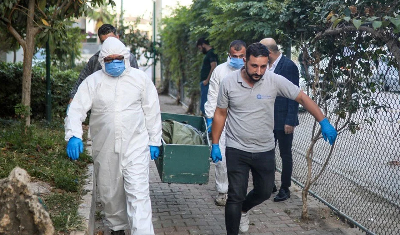 Olayın yaşandığı eve gelen ekipler çürümeye yüz tutmuş cesetlerin bulunduğu daireye girerken maske ve koruyucu kıyafetler giydi.