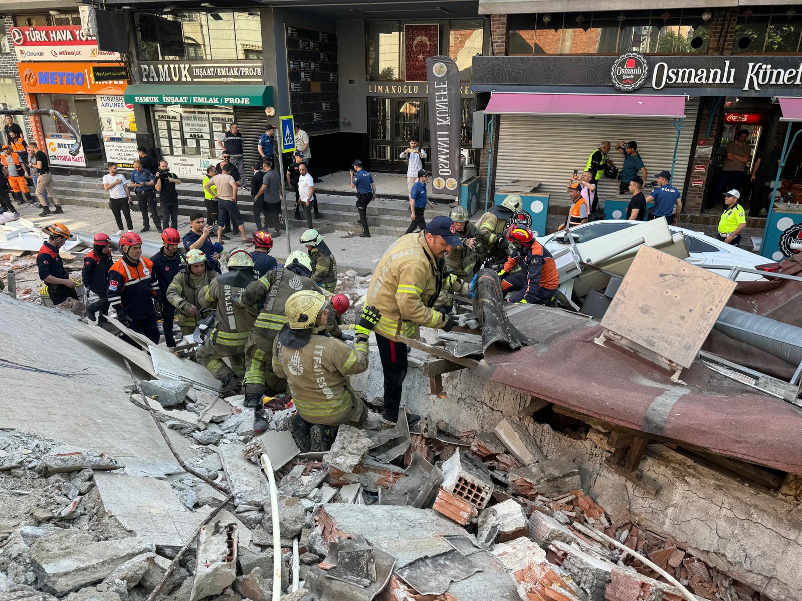 Öte yandan, çöken bina park halindeki araçların üzerine yıkılırken, yoldan geçen belediye otobüsünde de hasar oluştu.