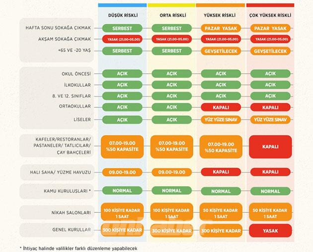 Orta riskli kategorideki illerde ise hafta sonu sokağa çıkma kısıtlaması cumartesi ve pazar günü kalktı. Türkiye genelinde sürdürülen 21.00 ile 05.00 saatleri arasındaki sokağa çıkma sınırlaması ise devam edecek.