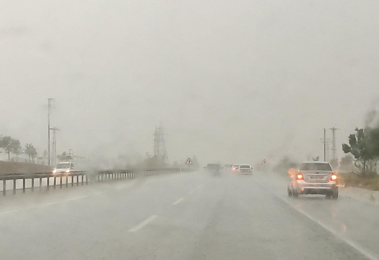 Şiddetli yağış nedeniyle kara yolunda trafik akışı durma noktasına geldi. Görüş mesafesinin düştüğü kara yolda vatandaşlar araçlarını bir süre yol kenarında park ederek bekledi.