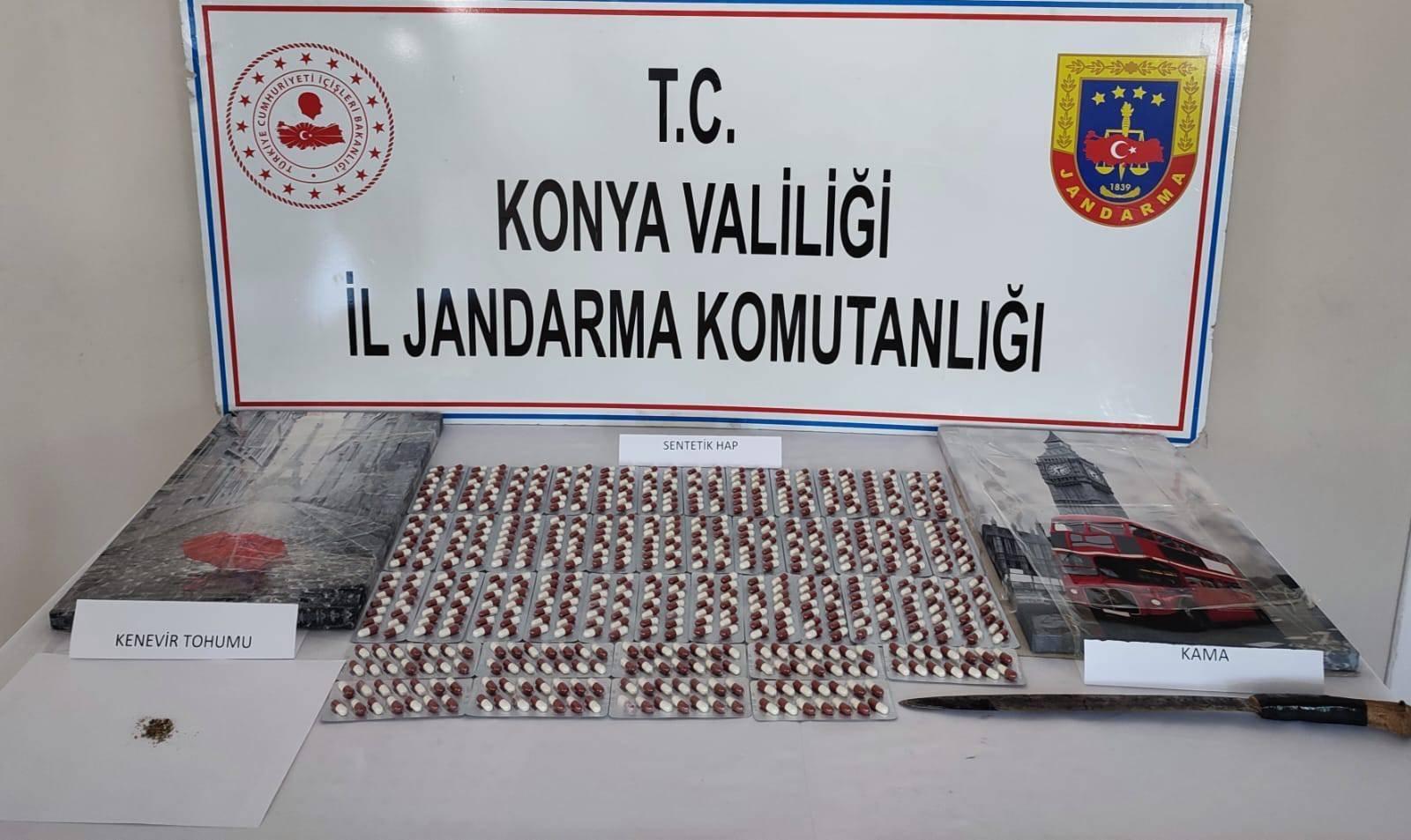 Araçta ve araç içerisinde bulunan F.K.E isimli şahsın üzerinde yapılan aramada toplamda 630 adet sentetik ecza, 5 gram kenevir tohumu ve 1 adet kama ele geçirildi.