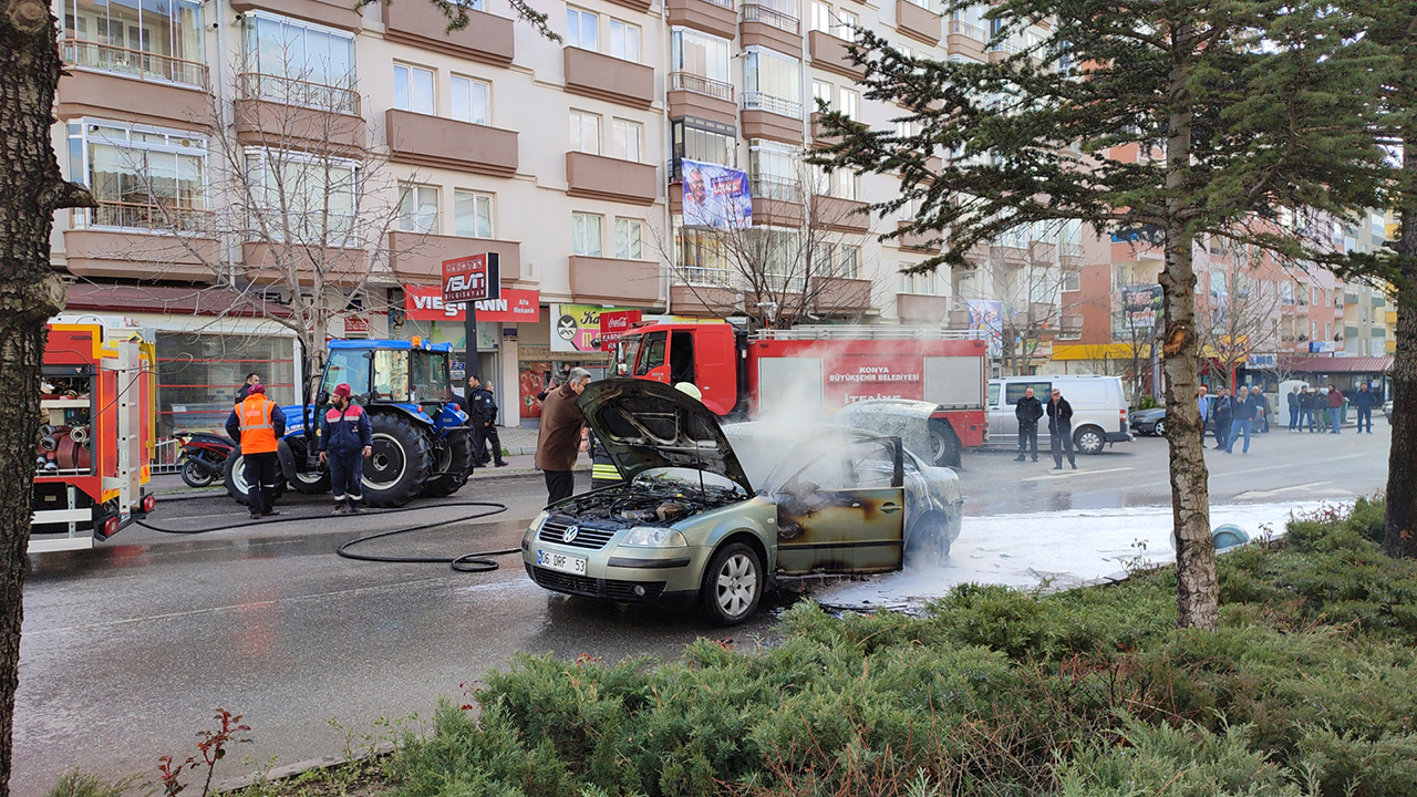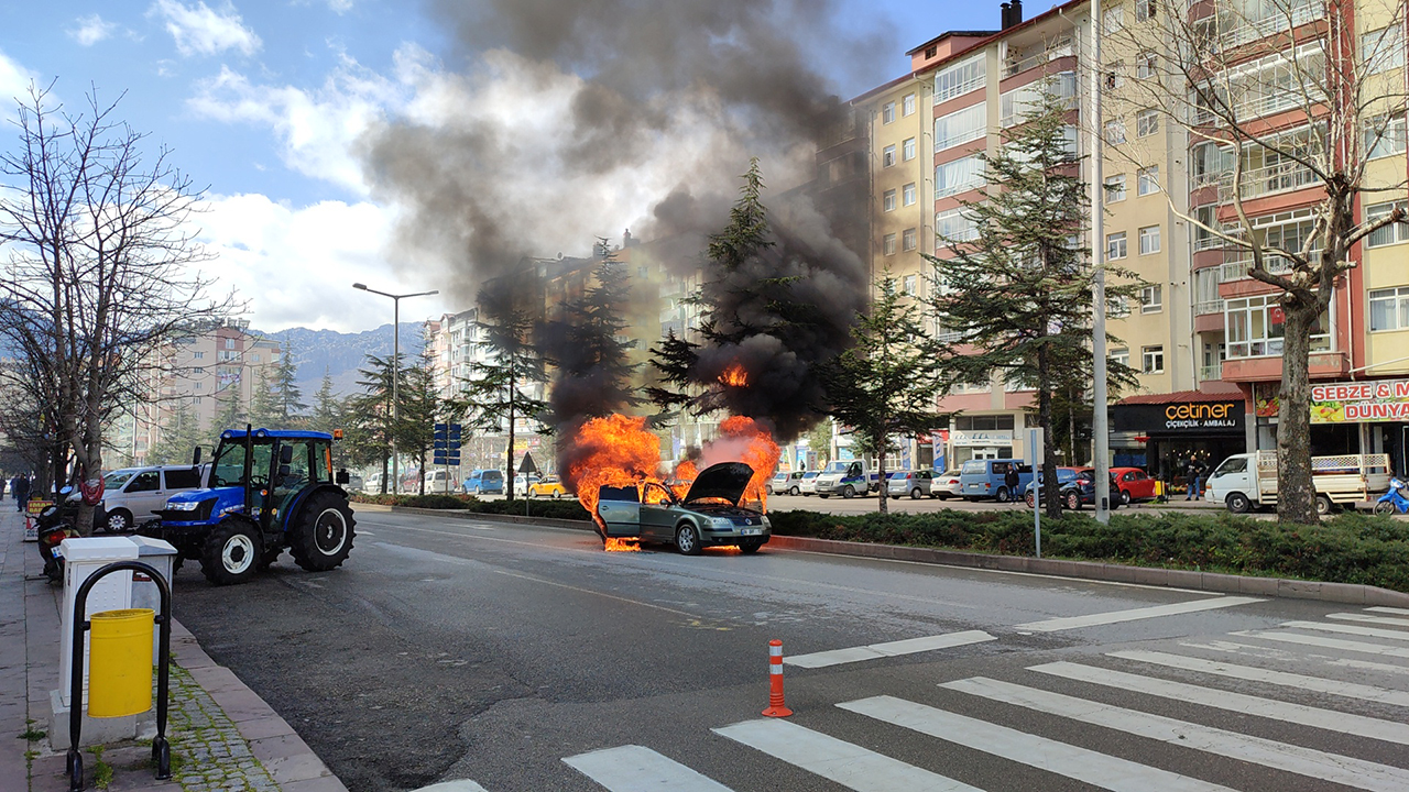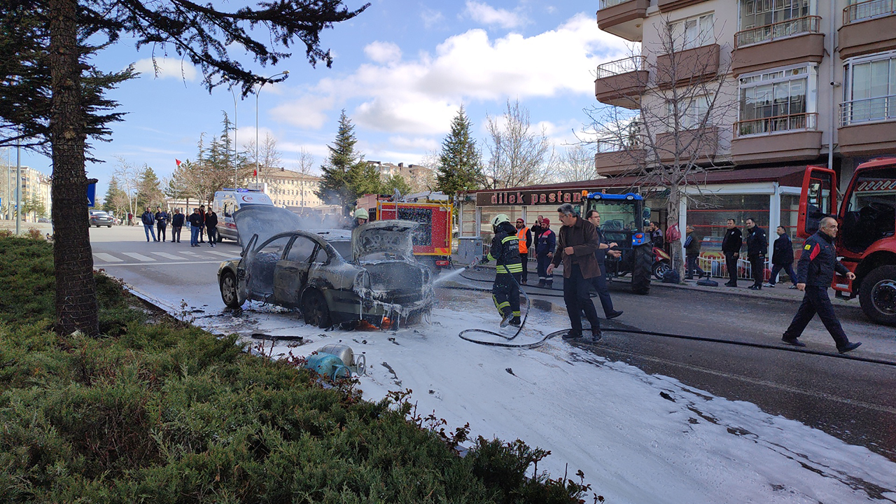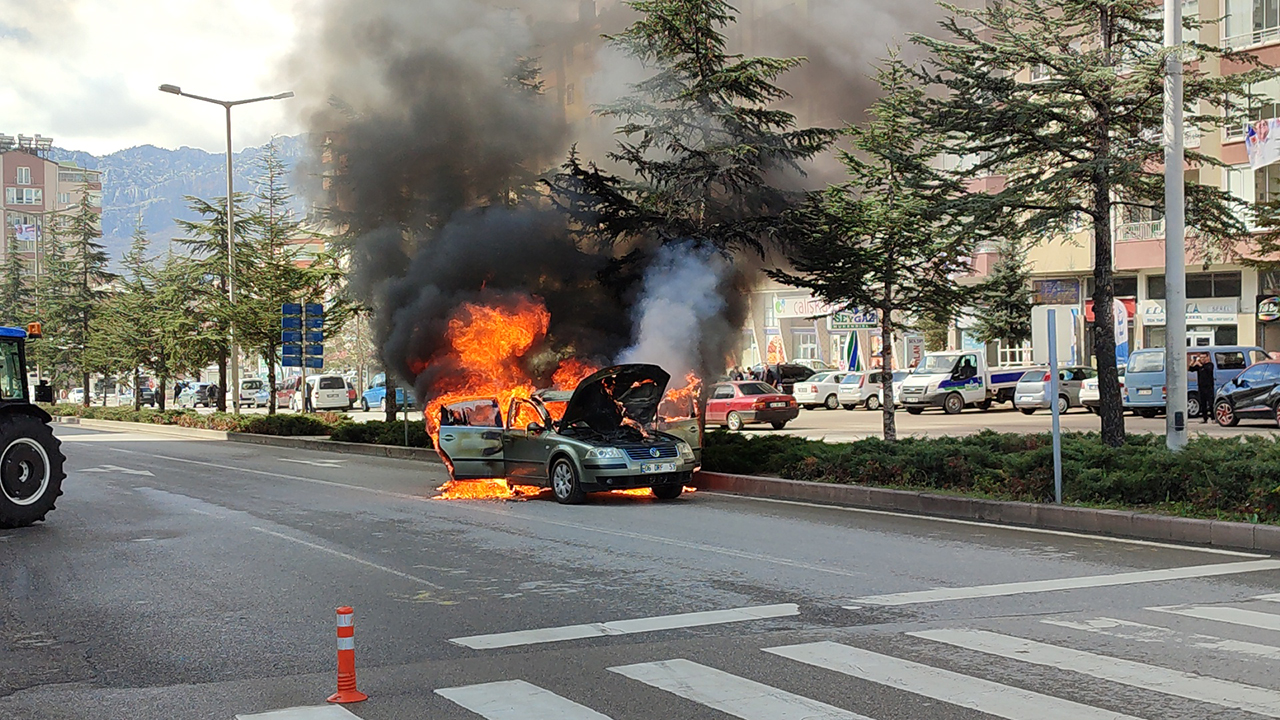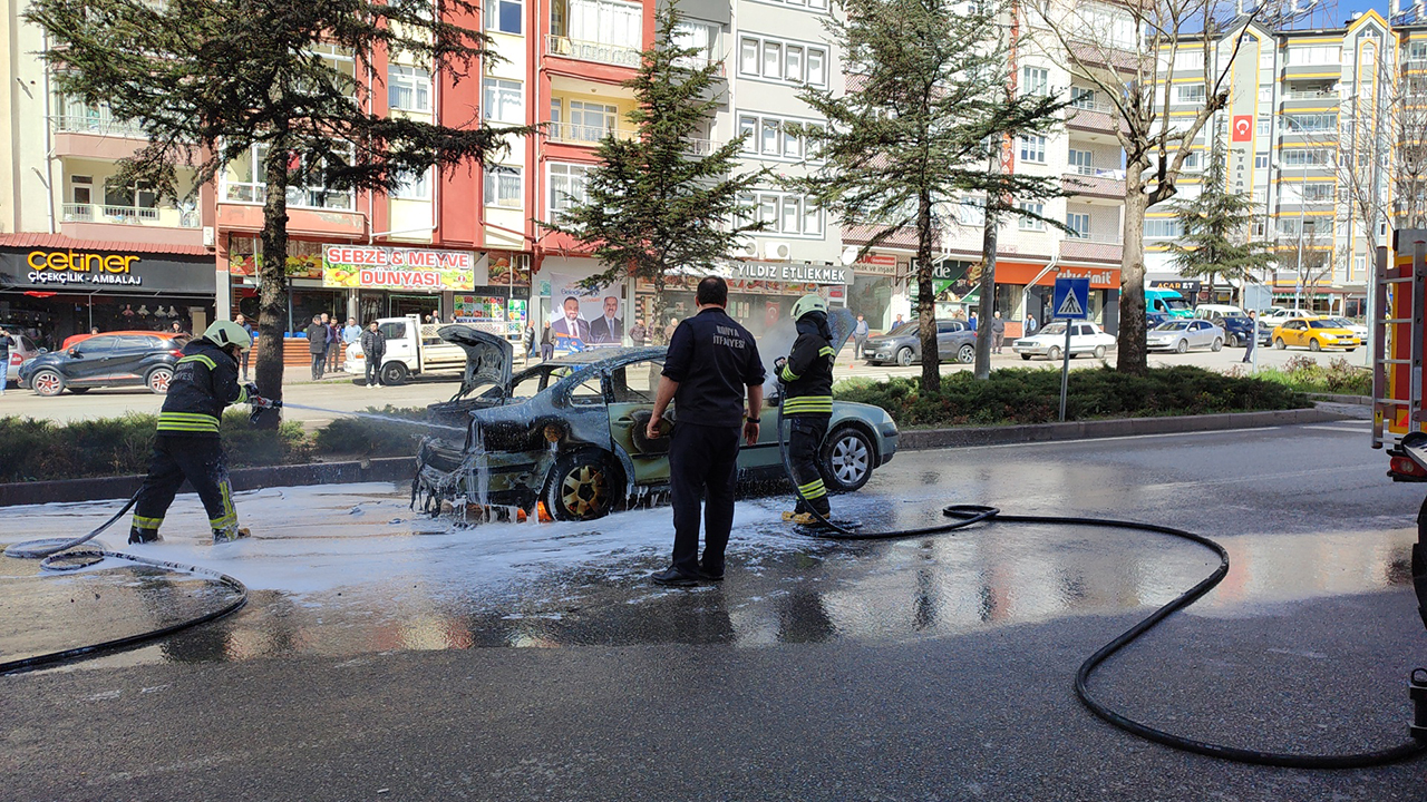 Kısa sürede otomobili saran alevler ekiplerin müdahalesiyle söndürülürken, araç kullanılamaz hale geldi.
