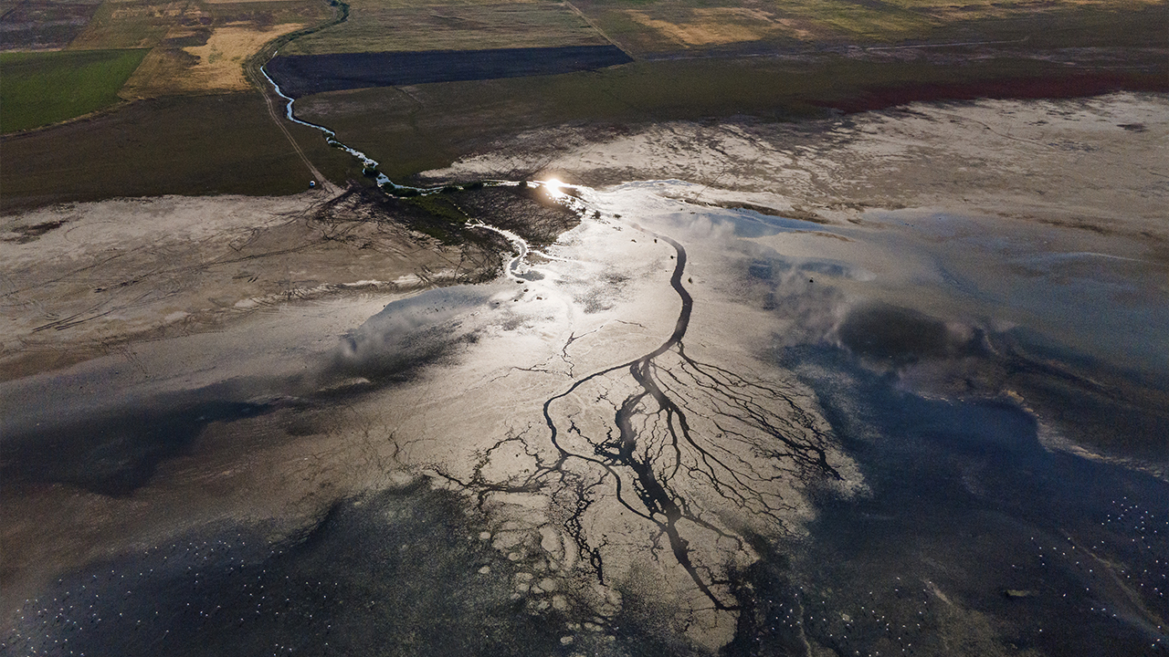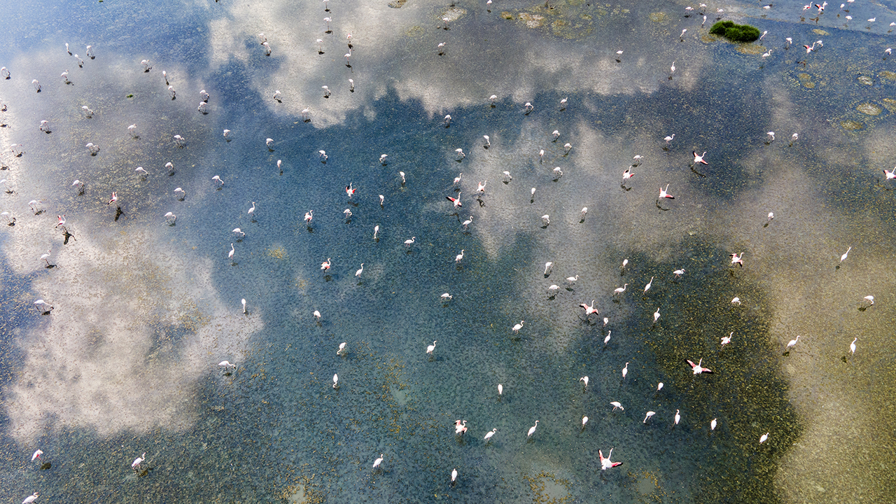 Konya'nın Kulu ilçesine 5 kilometre mesafede bulunan ve binlerce kuşa ev sahipliği yapan Düden Gölü'nün su seviyesi düştü. Düden Gölü’nü besleyen kanalın ağacı andıran dokusu ve flamingolar havadan görüntülendi.