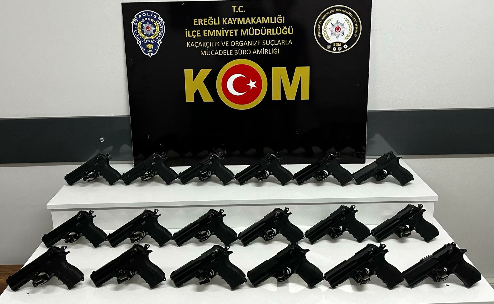 KOM ekiplerince Ereğli İlçesinde silah kaçakçılarına yönelik yapılan çalışmalar neticesinde, arama yapılan bir tırın dorsesine gizlenmiş vaziyette 18 adet tabanca ele geçirildi. 2 şahıs gözaltına alındı.