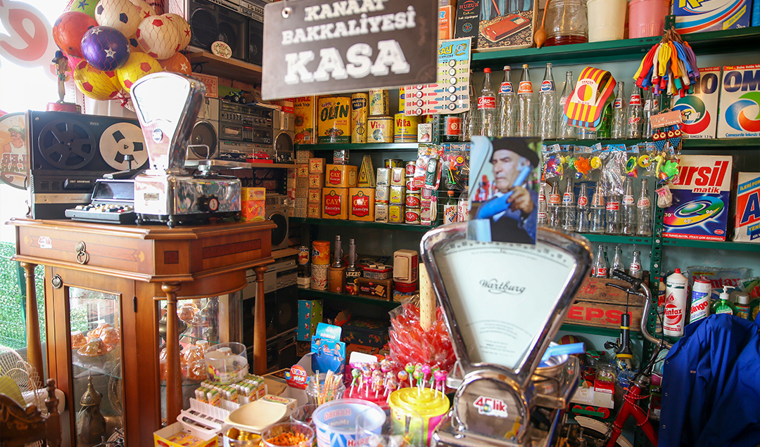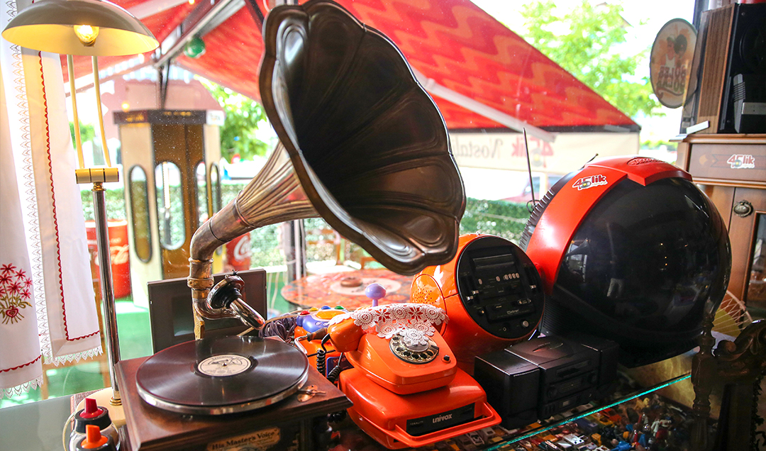 Kafe olarak da hizmet veren yer, rengarenk tüplü televizyonlar, gramofonlar, taş plaklar, taş bebekler, radyolar, gaz lambaları, dantel örtüler, eski bakkal ürünleri, nostaljik gazozlar, güğüm, el gırgırı, çiçek motifli perdelerle gelenleri yıllar öncesine götürüyor.