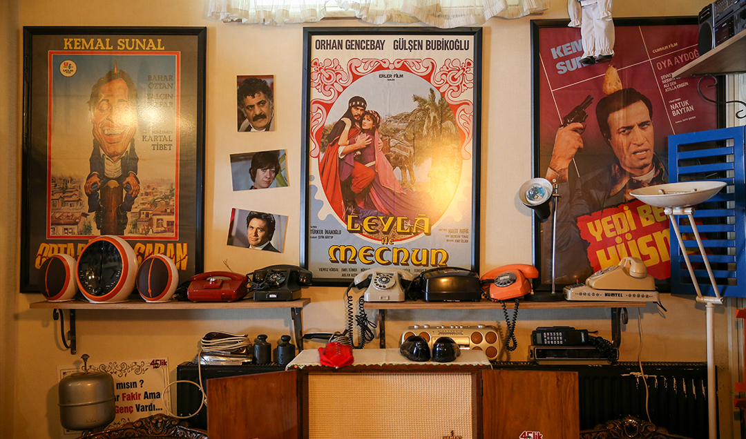 Kemal Sunal, Orhan Gencebay, Cüneyt Arkın, Türkan Şoray ve Kadir İnanır filmlerinin posterleriyle süslü duvarların ve nostaljik eşyaların önünde fotoğraf çektiren ziyaretçiler, geçmişi özlemle anıyor.