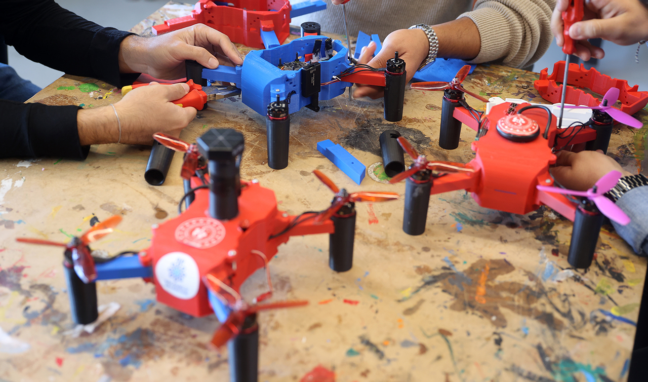 Deneyap Türkiye Teknoloji Atölyesi'nde çalışmaları sürdürdüklerini ifade eden Aydın, şunları kaydetti: "Burada bulunan cihaz ve aletleri kullanarak dronlarımızı ürettik. Dronlarımız düşme durumunda diğer dronlarda olduğu gibi kırıma uğramıyor. Bütün parçaları mekanik olarak montajlandı. Düştüğünde tamamı kırıma uğramıyor. Kırılan veya bozulan parçayı değiştirerek hızlıca tekrar uçar hale getirebiliyorsunuz. Birden fazla parçayı yapboz gibi mekanik montaj ile bir araya getirdiğimiz için kaza kırım yaşandığında dronun tamamını tamir etmek yerine sadece ilgili parçayı lokal olarak değiştiriyoruz. Geliştirdiğimiz sürü İHA sistemine Toygun adını verdik. Dünya üzerinde büyük firmaların tamamına yakını bu sürü İHA sistemleri üzerinde çalışıyor. Yüzlerce aracı sürü kategorisinde aynı anda kontrol ederek dünyada lider ülkeler arasına girmek istiyoruz."