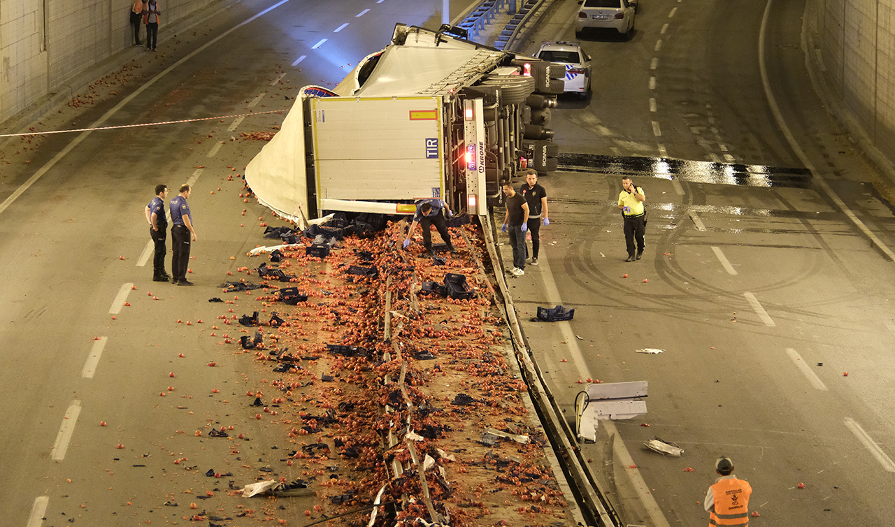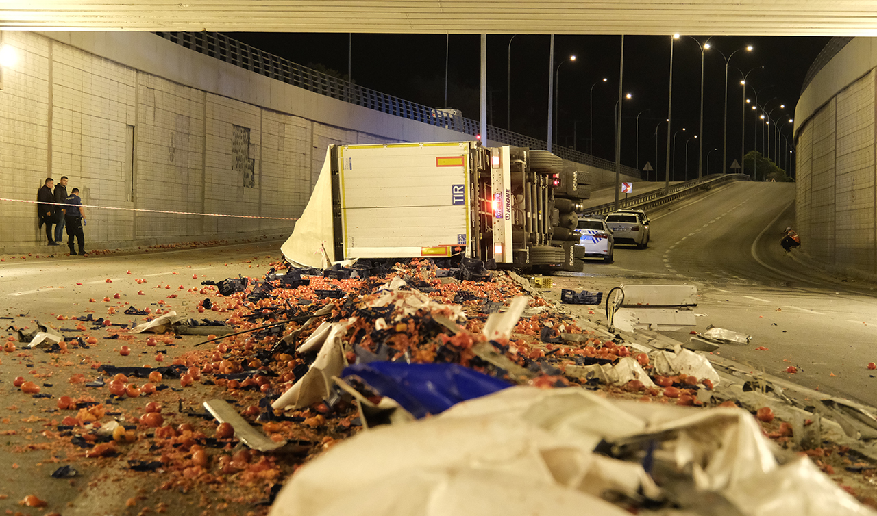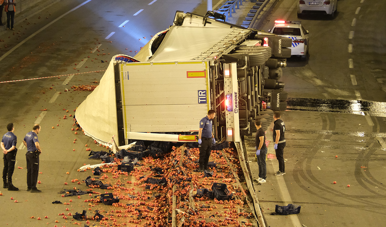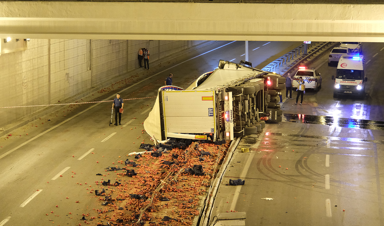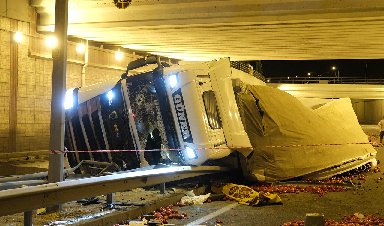 Konya-Adana kara yolunda kimliği henüz belirlenemeyen sürücünün kullandığı, 07 AJM 447 plakalı domates yüklü TIR, Karapınar Devlet Hastanesi alt geçidinde kontrolden çıkarak refüje çarptı.