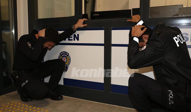 Konya İl Emniyet Müdürlüğü’ne bağlı Şubeler ve polis merkezlerindeki tatbikatta, müdürler, amirler, komiserler ile polis memurları katıldı. Sirenler çaldığında "çök kapan tutun" hareketini uyguladı.