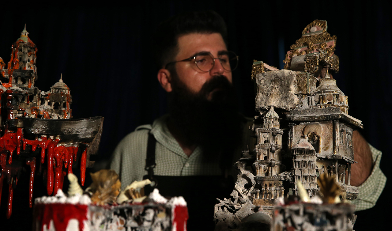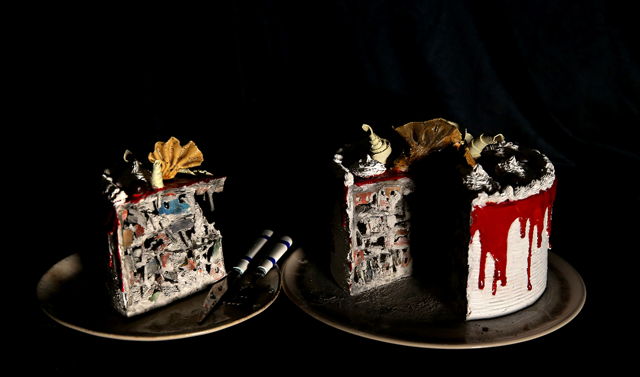 Filistinli kız çocuğunun doğum günü pastasını da tasvir eden bir eser ortaya çıkaran Coşkun, pastanın içinde, Gazze'de sivillerin katledilmesini ve yaşanan yıkımı anlatıyor.