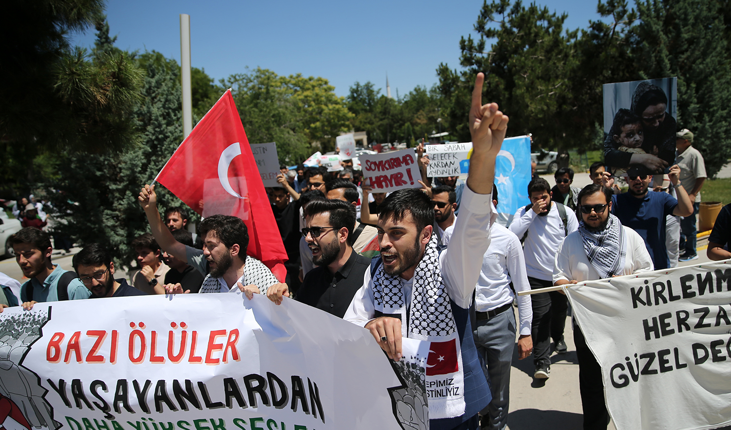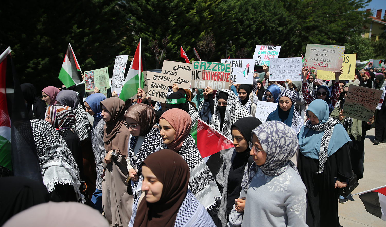 Üniversite kampüsünde yürüyüş yapan öğrenciler ve akademisyenler, ilahiyat fakültesi önünde Filistin'e yönelik saldırılara tepki gösterdi, pankartlar ve Filistin bayraklarıyla İsrail'i protesto etti.