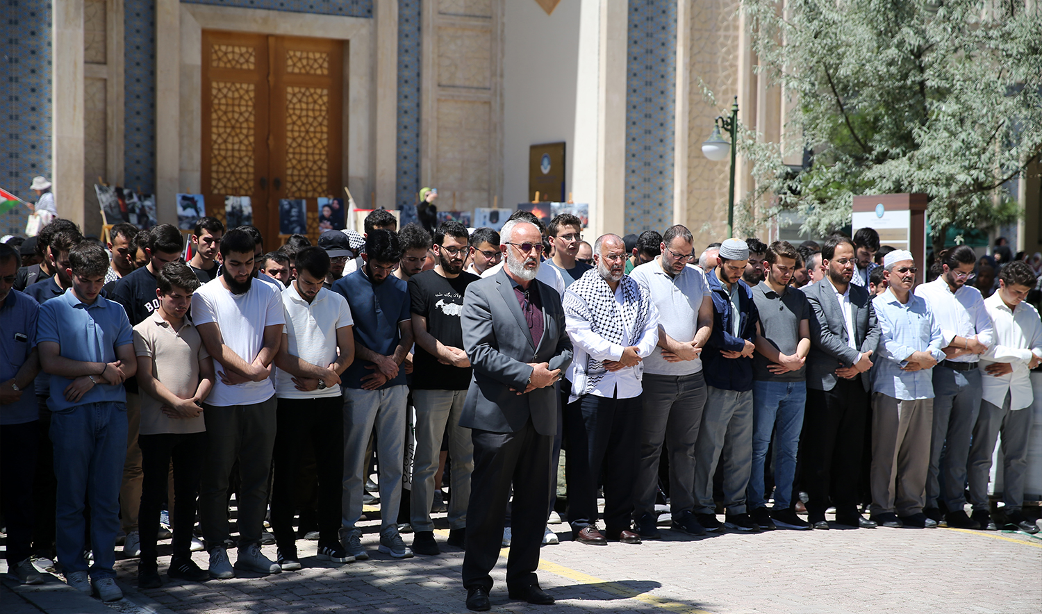 Filistin'de hayatını kaybedenler için gıyabi cenaze namazı kılan öğrenciler, ardından oturma eylemi yaptı.