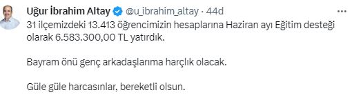 Altay paylaşımında, "Bayram önü genç arkadaşlarıma harçlık olacak. Güle güle harcasınlar, bereketli olsun." notunu düştü.