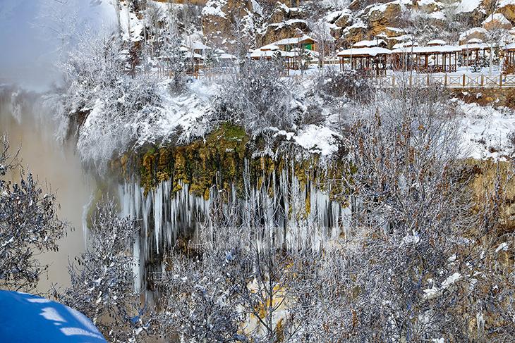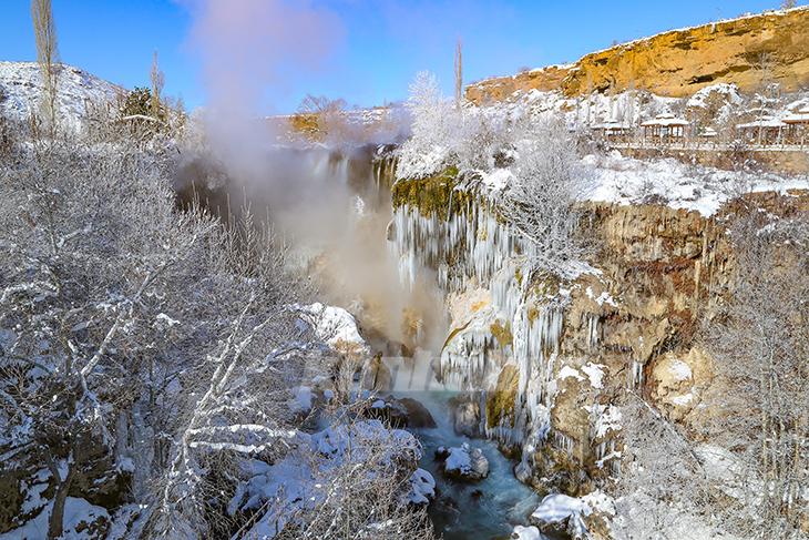 Hava sıcaklığının mevsim normallerinin altında seyretmesi nedeniyle şelalede oluşan buz sarkıtları ve su buharı görsel şölen sunuyor.