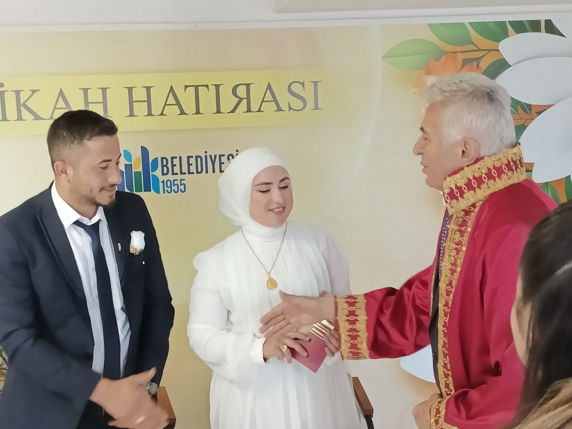 Hüyük Belediyesi nikah salonunda yapılan törende Belediye Başkanı Sefer, nikah şahitlerinin imzaları sonrasında çifte ömür boyu mutluluklar dileyerek, evlilik cüzdanını Yasemin Yıldız'a verdi.