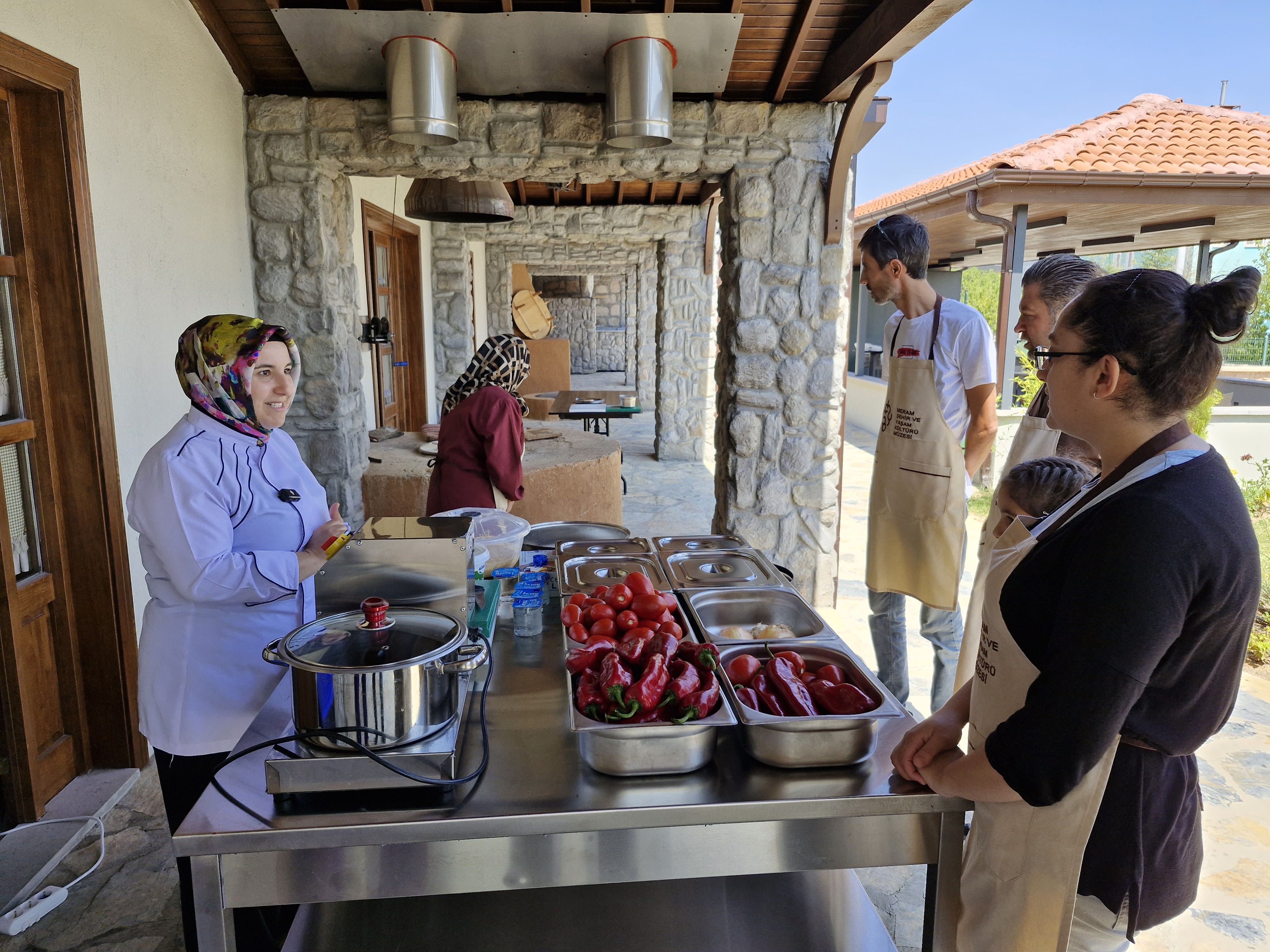 Konya Mutfağı’nın eşsiz yemeklerini, şehrin en lezzetli atölyesi Müze Meram Yemek Atölyesi’nde deneyimleyerek öğrenen katılımcılar bu sefer de, sonbahar ve kış sofralarının olmazsa olmazı turşu, tarhana, domates ve biber salçası yapmanın püf noktalarını işin uzmanlarından deneyimleyerek öğrendiler.
