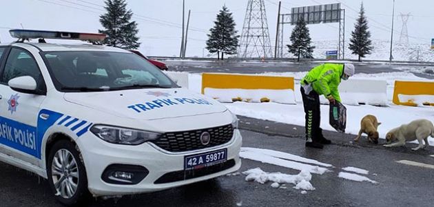 Havaların soğumasıyla birlikte Konya İl Emniyet Müdürlüğü Seydişehir Bölge Trafik Denetleme İstasyon Amirliği Ekipleri, soğukta üşüyen sokak hayvanlarına mama bıraktı.