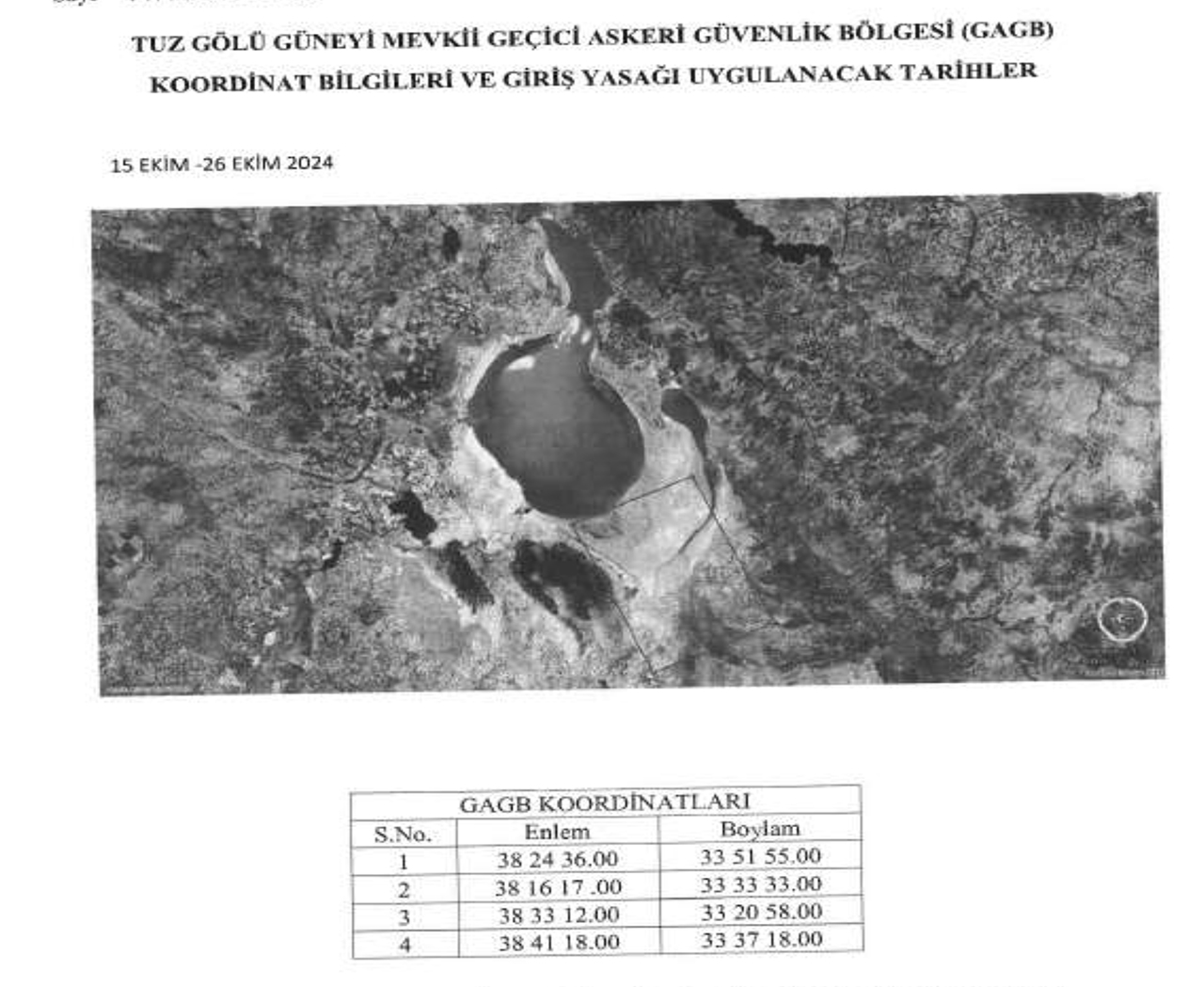 Tuz Gölü güneyini, icra edilmesi planlanan füze atış testlerinin güvenli bir şekilde gerçekleştirilmesi amacıyla 15 Ekim- 25 Ekim tarihleri arasında geçici askeri güvenlik bölgesi olarak ilan edildi.