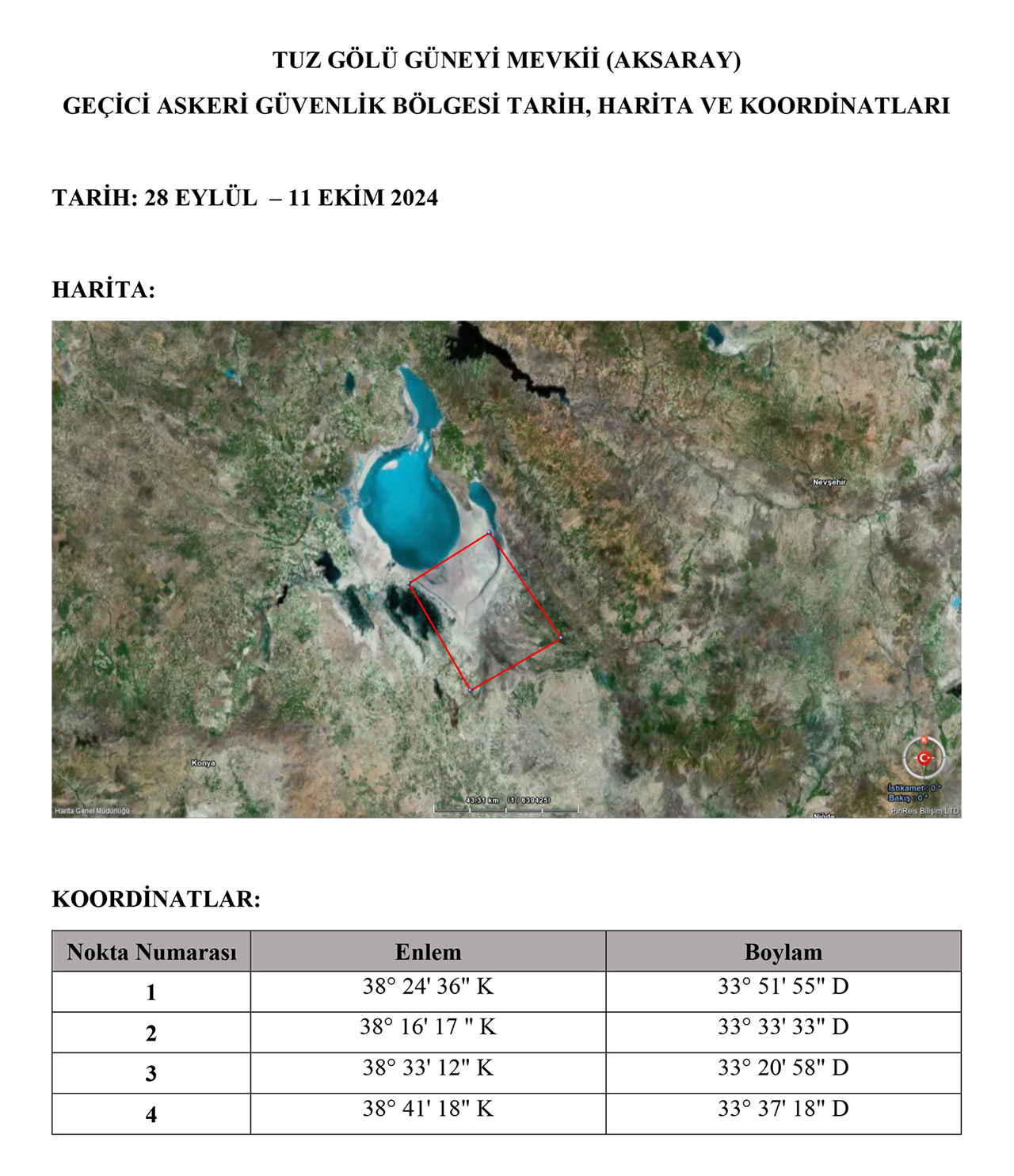 Konuyla ilgili Konya Valiliğinden yapılan açıklamada şu ifadelere yer verildi: "Millî Savunma Bakanlığının talebi doğrultusunda Aksaray ili Tuz Gölü güneyinde, icra edilmesi planlanan füze atış testlerinin emniyetli bir şekilde gerçekleştirilebilmesi amacıyla, geçici askeri güvenlik bölgesi olarak ilan edildiği bildirilmiştir. Bu kapsamda Askeri Yasak Bölgeler ve Güvenlik Bölgeleri Yönetmeliğinin 20’nci maddesi gereğince, söz konusu bölgeye ilişkin koordinat bilgileri ve giriş yasağı uygulanacak tarihler mahalli basın ve yayın organlarında yayımlanmak üzere gönderilmiştir" denildi.