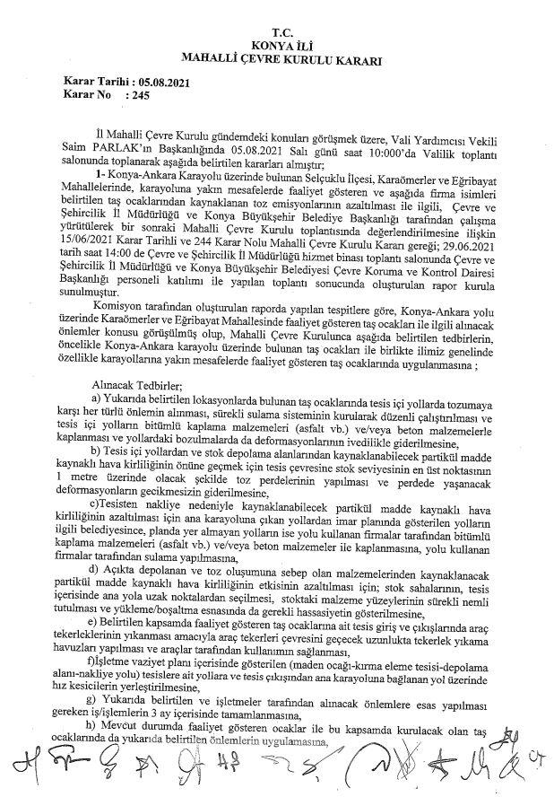 1- Konya-Ankara Karayolu üzerinde bulunan Selçuklu İlçesi, Karaömerler ve Eğribayat Mahallelerinde, karayoluna yakın mesafelerde faaliyet gösteren ve aşağıda firma isimleri belirtilen taş ocaklarından kaynaklanan toz emisyonlarının azaltılması ile ilgili, Çevre ve Şehircilik İl Müdürlüğü ve Konya Büyükşehir Belediye Başkanlığı tarafından çalışma yürütülerek bir sonraki Mahalli Çevre Kurulu toplantısında değerlendirilmesine ilişkin 15/06/2021 Karar Tarihli ve 244 Karar Nolu Mahalli Çevre Kurulu Kararı gereği; 29.06.2021 tarih saat 14:00 de Çevre ve Şehircilik İl Müdürlüğü hizmet binası toplantı salonunda Çevre ve Şehircilik İl Müdürlüğü ve Konya Büyükşehir Belediyesi Çevre Koruma ve Kontrol Dairesi Başkanlığı personeli katılımı ile yapılan toplantı sonucunda oluşturulan rapor kurula sunulmuştur. Komisyon tarafından oluşturulan raporda yapılan tespitlere göre, Konya-Ankara yolu üzerinde Karaömerler ve Eğribayat Mahallesinde faaliyet gösteren taş ocakları ile ilgili alınacak önlemler konusu görüşülmüş olup, Mahalli Çevre Kurulunca aşağıda belirtilen tedbirlerin, öncelikle Konya-Ankara karayolu üzerinde bulunan taş ocakları ile birlikte ilimiz genelinde özellikle karayollarına yakın mesafelerde faaliyet gösteren taş ocaklannda uygulanmasına;