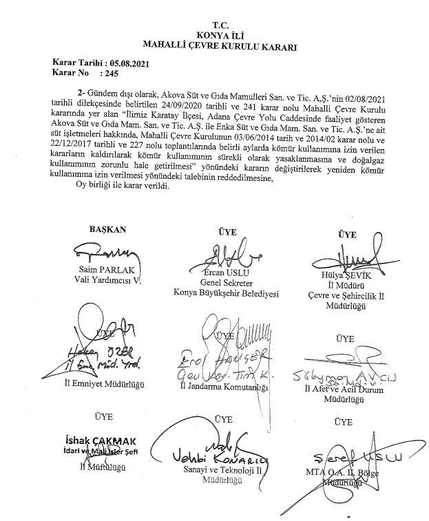 2- Gündem dışı olarak, Akova Süt ve Gıda Mamulleri San. ve Tie. A,Ş.'nin 02/08/2021 tarihli dilekçesinde belirtilen 24/09/2020 tarihli ve 241 karar nolu Mahalli Çevre Kumlu kararında yer alan "ilimiz Karatay İlçesi, Adana Çevre Yolu Caddesinde faaliyet gösteren Akova Süt ve Gıda Mam. San. ve Tic. A.Ş. ile Enka Süt ve Gıda Mam. San. ve Tic. A.Ş.'ne ait süt işletmeleri hakkında, Mahalli Çevre Kurulunun 03/06/2014 tarih ve 2014/02 karar nolu ve 22/12/2017 tarihli ve 227 nolu toplantılarda belirli aylarda kömür kullanımına izin verilen kararların kaldırılarak kömür kullanımının sürekli olarak yasaklanmasına ve doğalgaz kullanımının zorunlu hale getirilmesi" yönündeki kararın değiştirilerek yeniden kömür kullanımına izin verilmesi yönündeki talebinin reddedilmesine, Oy birliği ile karar verildi.