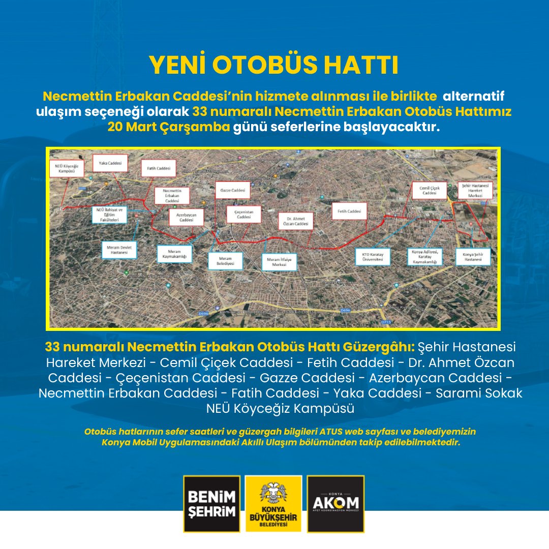 Konya AKOM sosyal medya hesabından ulaşım duyurusu yaptı. Yeni ulaşım hattı 33 numaralı yeni otobüs seferinin güzergahı paylaşıldı.