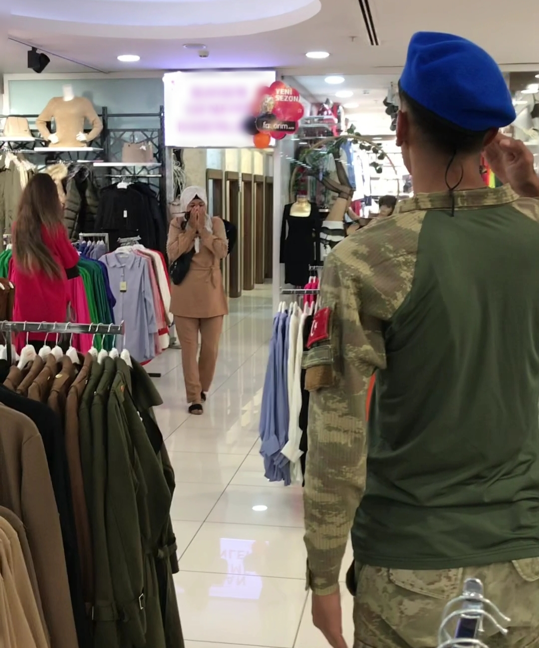 Askerlik vazifesini tamamlayan 21 yaşındaki Piyade Er Fırat Kasımoğlu, ailesinin ikamet ettiği memleketi Konya'nın Kulu ilçesine geldi. Askeri üniformasıyla birlikte, ilçedeki bir AVM'nin giyim bölümde alışveriş yapan annesinin yanına giderek sürpriz yapmak isteyen Piyade Er Kasımoğlu, sessizce yaklaşarak annesi Gülcan ve yanında bulunan kız kardeşi Medine Kasımoğlu'na tekmil getirdi.