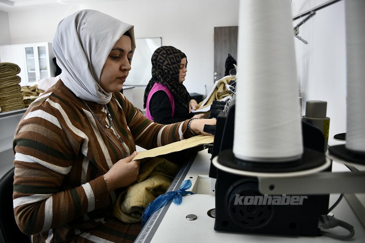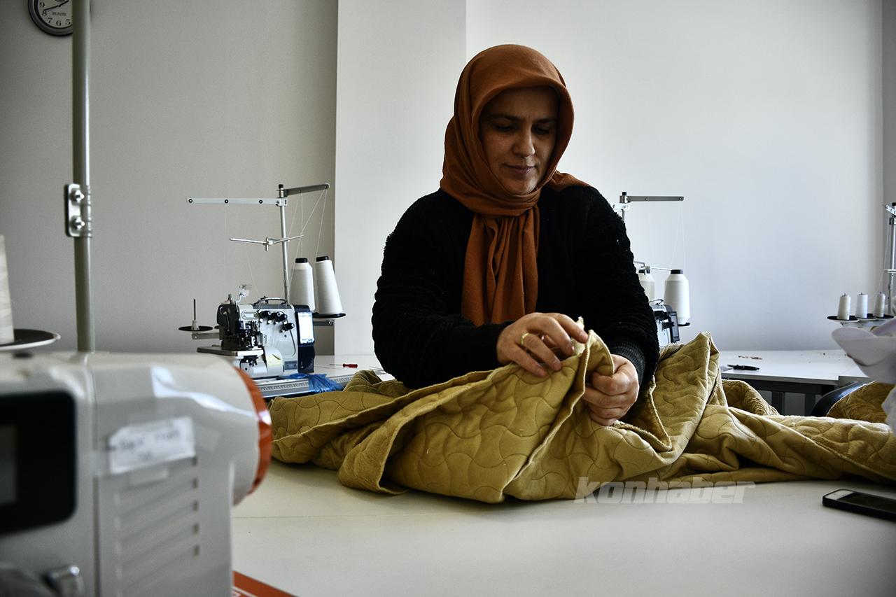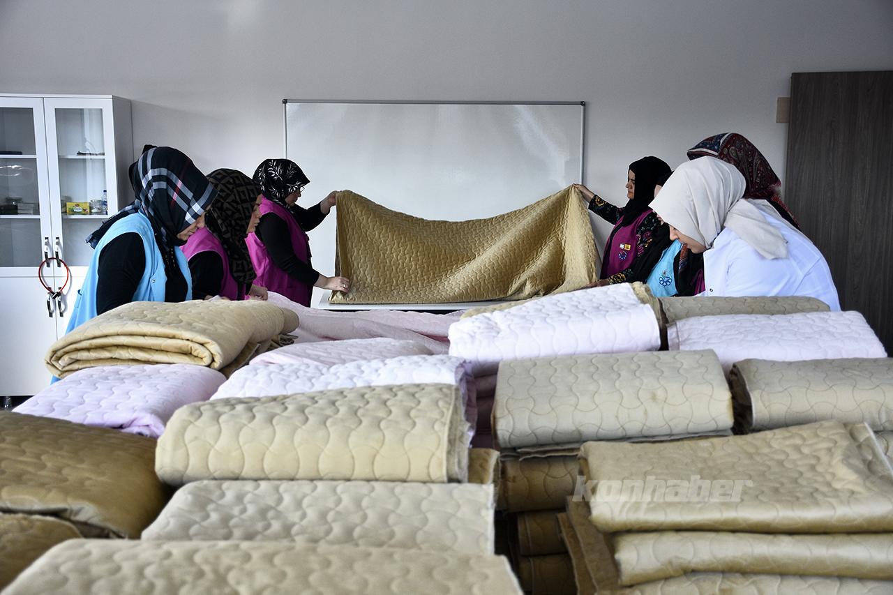 Konya Büyükşehir Belediyesi Meslek Edindirme Kursları'nda (KOMEK) gönüllüler, Kahramanmaraş merkezli ve 10 ili etkileyen depremler sonrası bölgeye gönderilmesi için battaniye hazırlıyor.