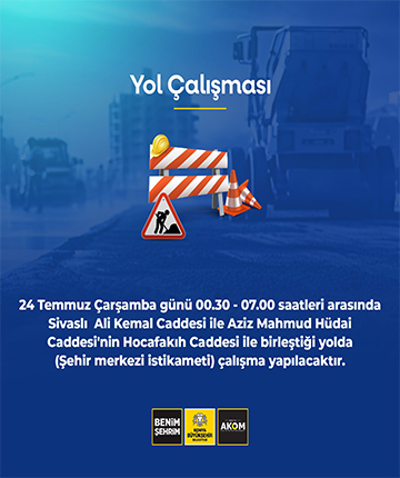 Konya AKOM’dan yapılan duyuruya göre 24 Temmuz Çarşamba günü 00.30-07.00 saatleri arasında Sivaslı Ali Kemal Caddesi ile Aziz Mahmud Hüdai Caddesi'nde yapılacak yol çalışması sebebiyle araç trafiğine kapatılacağını duyurdu.