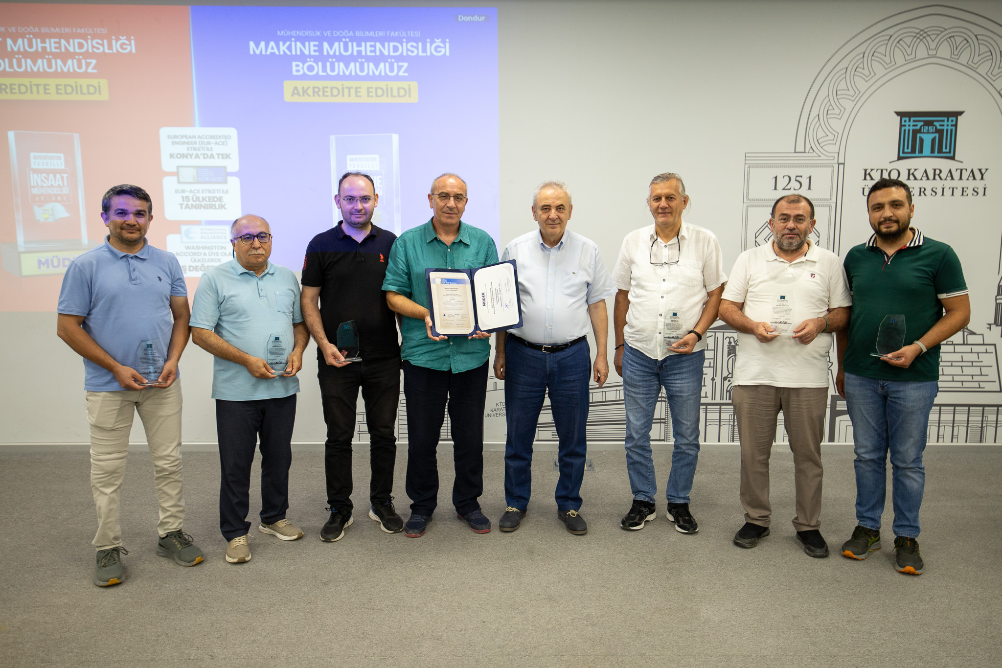 KTO Karatay Üniversitesi’nde düzenlenen “İnşaat Mühendisliği ve Makine Mühendisliği Bölümleri Akreditasyon Ödül Töreni"ne, KTO Karatay Üniversitesi Rektörü Prof. Dr. Fevzi Rifat Ortaç, Rektör Yardımcısı Prof. Dr. Mehmet Çelik, Mühendislik ve Doğa Bilimleri Fakültesi Dekanı Prof. Dr. Faruk Ünsaçar, İnşaat Mühendisliği Bölüm Başkanı Prof. Dr. Mehmet Faik Sevimli, Makine Mühendisliği Bölüm Başkanı Dr. Öğr. Üyesi Remzi Şahin ve akademisyenler katıldı.