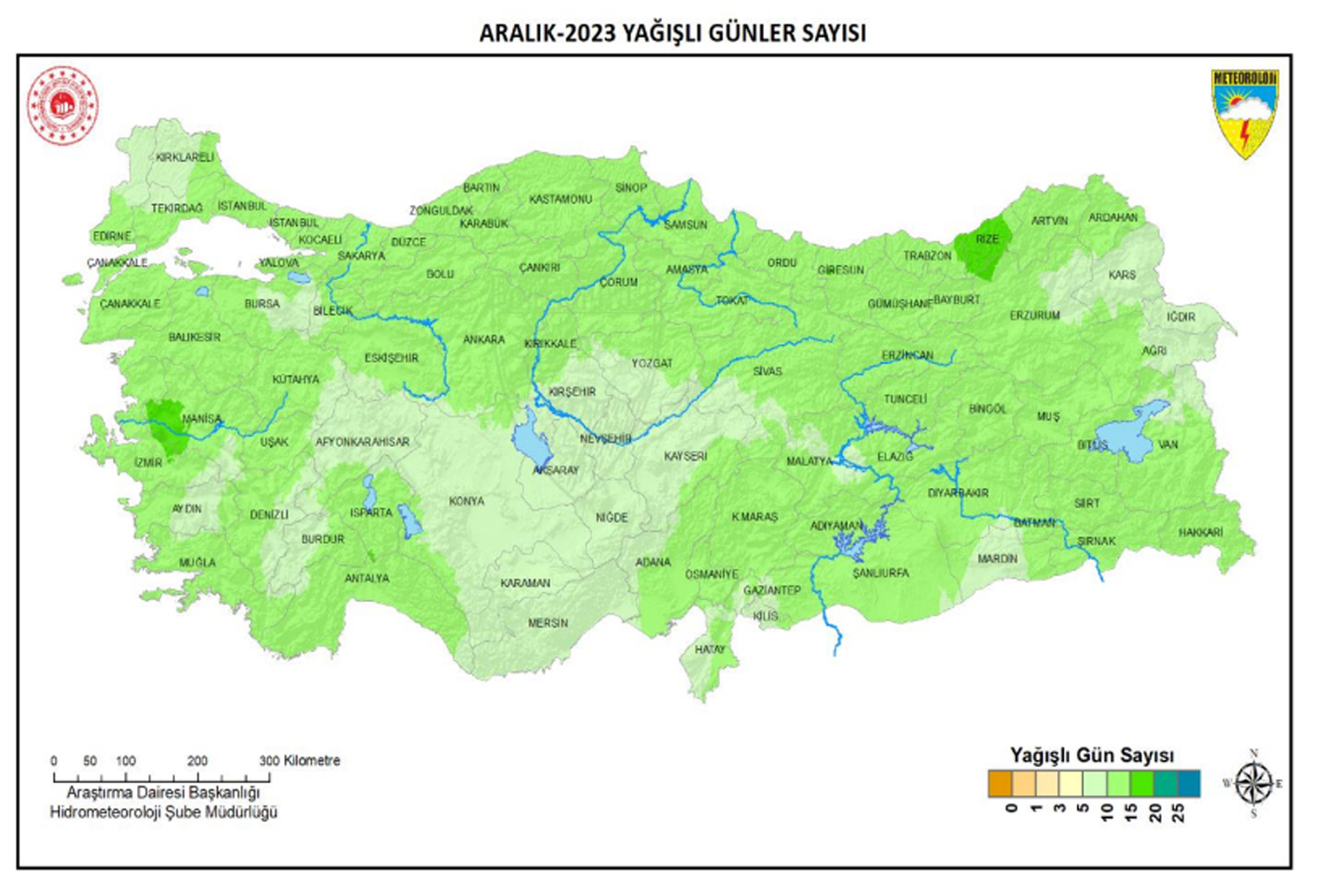 Havzalara göre aralık yağışlarında normaline göre en fazla artış yüzde 21 ile Fırat-Dicle Havzası'nda, en fazla azalma yüzde 50 ile Akarçay Havzası'nda gerçekleşti. En fazla yağışı 129 kilogram ile Antalya Havzası aldı. Yağışlı gün sayısı Türkiye genelinde aralık ayında ortalama 11,3 yağışlı gün olarak görüldü. Yağışlı gün sayıları Rize, Trabzon, İzmir ve Manisa çevrelerinde 15-20 gün aralığında, İç Anadolu'nun güneyi, Aydın, Denizli Mersin, Kars, Iğdır ve Mardin çevrelerinde ise yer 10 günün altında gerçekleşti.