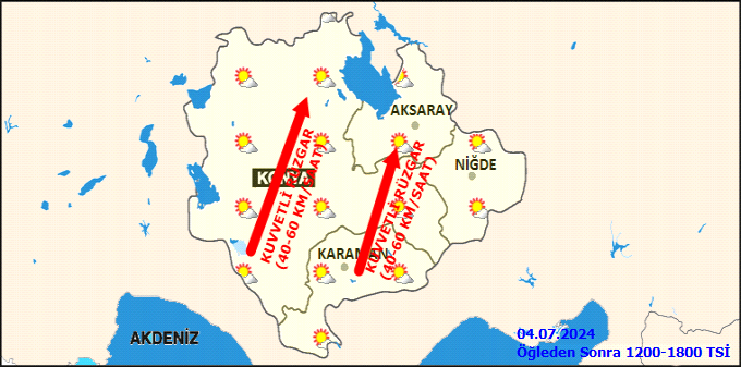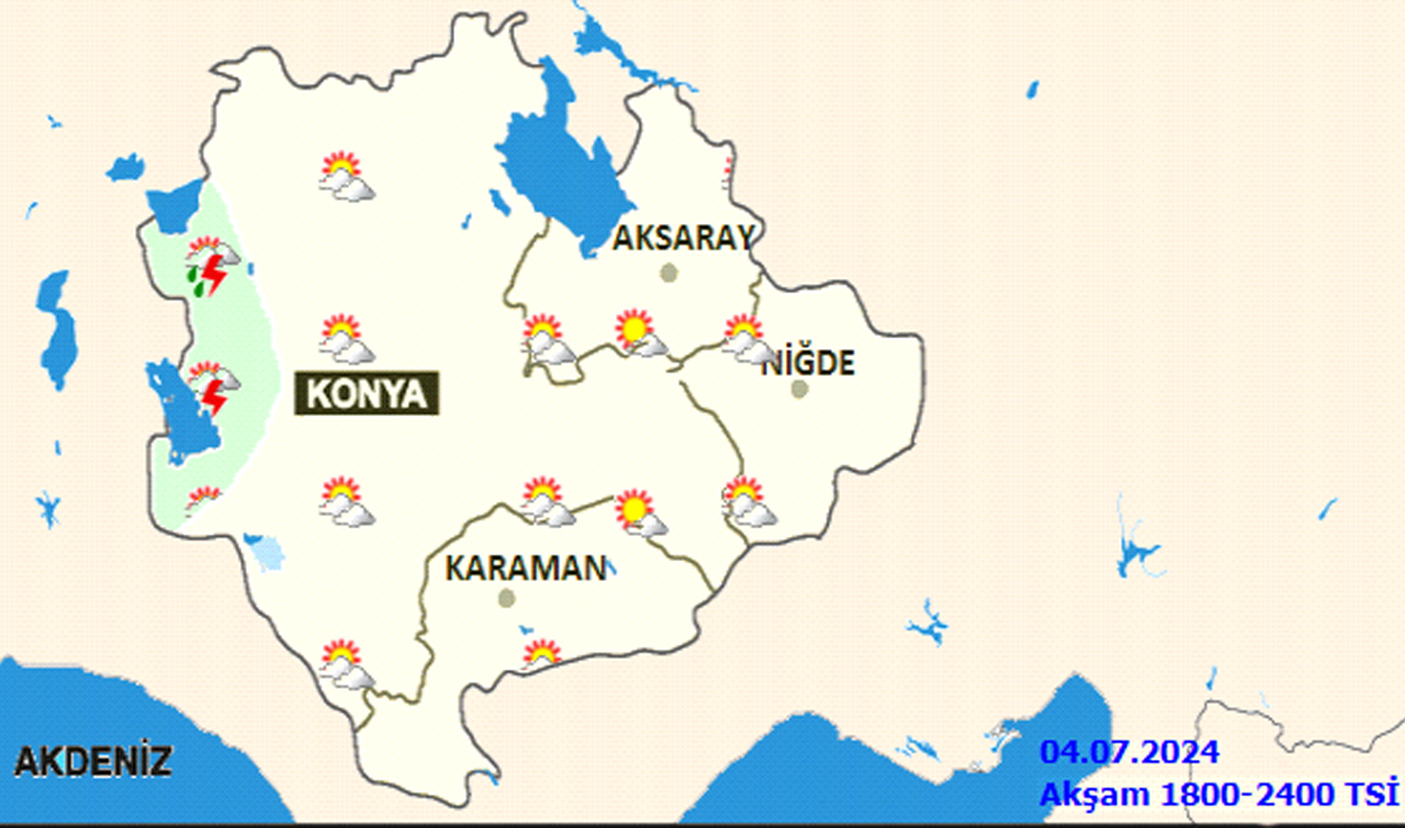 Meteorolojinin son hava tahmin raporuna göre Konya’da havanın bugün (4 Temmuz Perşembe) parçalı ve az bulutlu, akşam saatlerinde ise kentin batı kesimlerinde (Akşehir, Beyşehir, Derbent, Derebucak, Doğanhisar, Hüyük, Ilgın) yerel sağanak ve gök gürültülü sağanak yağış bekleniyor.