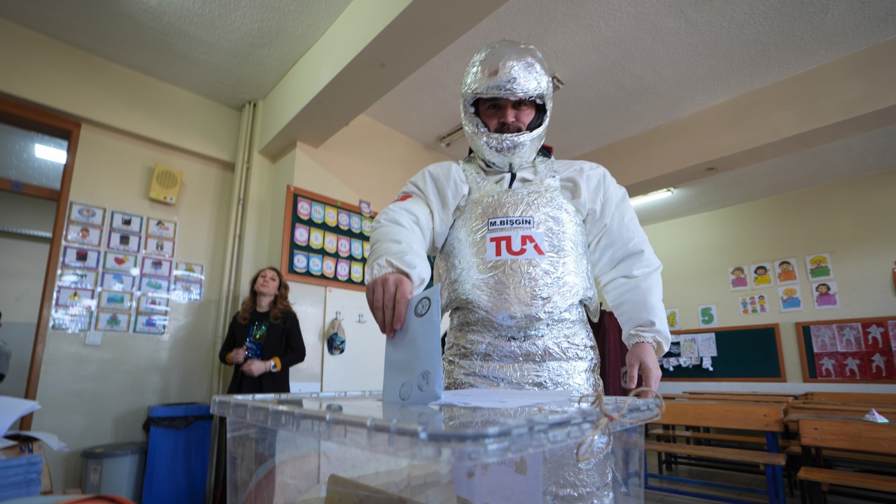 Beyciler Mahallesi'ndeki evinden astronot kostümünü giyerek çıkan 34 yaşındaki Bişgin, oy kullanacağı Beyciler İlkokulu'na gitti.Kendisine yoğun ilgi gösteren vatandaşlarla fotoğraf çektiren Bişgin, daha sonra 1085 numaralı sandıkta oyunu kullandı.