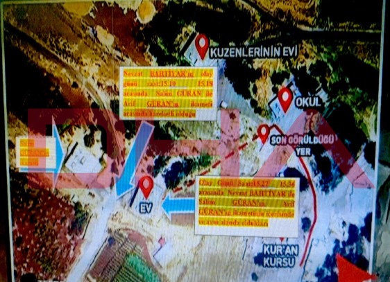2-Şüpheli Enes Güran’ın kullandığı telefonun HTS kayıtları incelendiğinde, 21.08.2024 günü saat 14.30 sıralarında ikametinde olduğu, saat 15.41’e kadar GPRS almaya devam ettiği, saat 15.41’de ikametinden baz verdiği ve saat 15.51’e kadar ikametin içerinde ve müştemilatında bulunduğu, saat 15.57’de Salim Güran’ın evine geçiş yaptığı, burada bulunduğu saat 16.04 arası yerini tam tespit edemediğimiz bir bölgede bulunduğu, saat 16.11 gibi kendi evine doğru yöneldiği, daha sonra saat 17.50’ye kadar ikamet ve müştemilatında bulunduğu ara ara hareketli olduğu, saat:17.50’den sonra ikametin dışında bulunduğu, ikamet çevresinde hareketli olduğu daha sonra aynı gün saat 18.13 sıralarında okul civarına yakın bir bölgede telefonunu kapattığı ya da kapandığı, 22.08.2024 günü saat 04.44’te de telefonun açıldığı,
